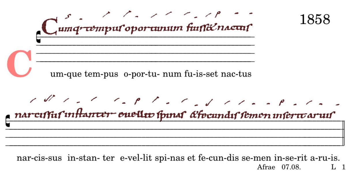Cumque tempus oportunum fuisset nactis / narcissus instanter evellit spinas et fecundis semen inserit aruis.