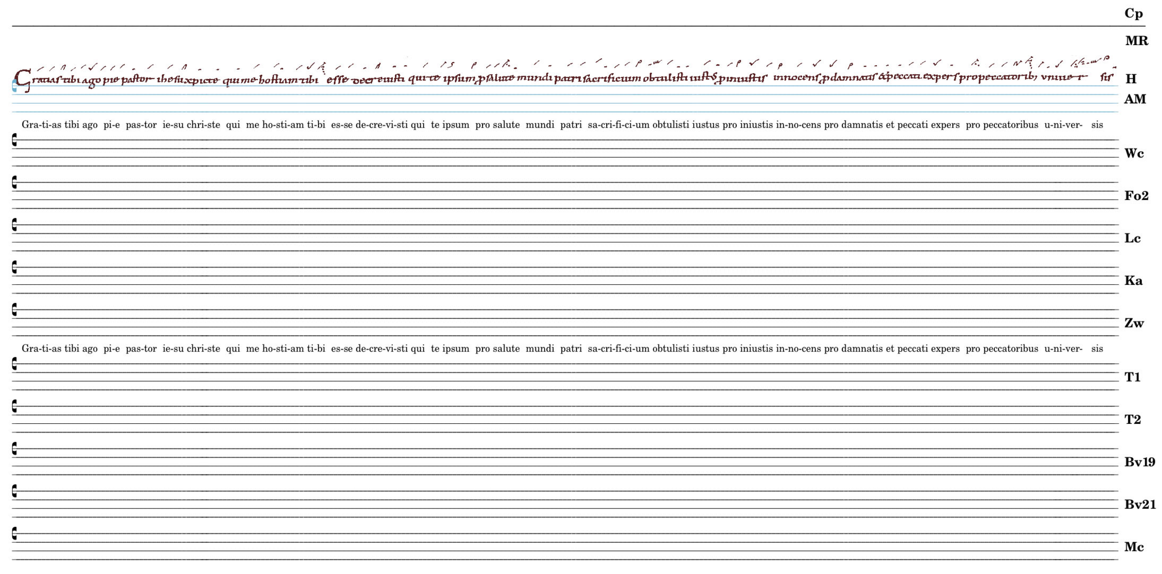 Gratias tibi ago / pie pastor / iesu christe / qui me hostiam tibi esse decrevisti / qui te ipsum pro salute mundi patri sacrificium obtulisti / iustus pro iniustis innocens pro damnatis / et peccati expers pro peccatoribus universis.