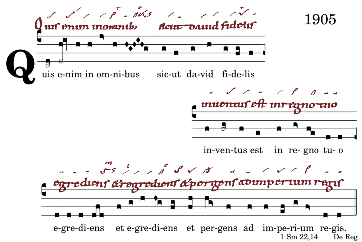 Quis enim in omnibus / sicut david fidelis / inventus est in regno tuo / egrediens / et egrediens / et pergens / ad imperium regis.