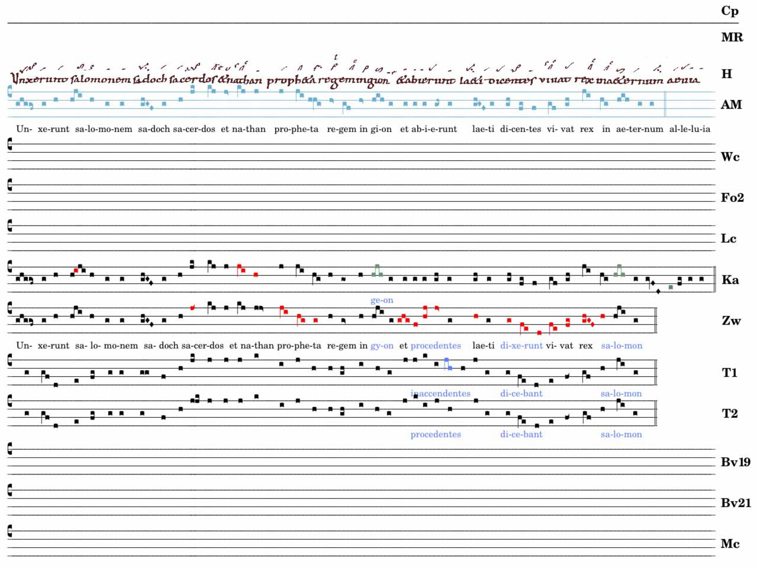 Unxerunt salomonem / sadoc sacerdos et nathan / propheta regem in gión / et abierunt laeti dicentes : vivat rex ↔ in aeternum alleluia.