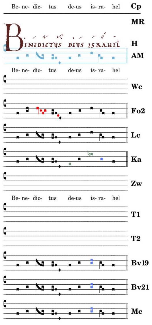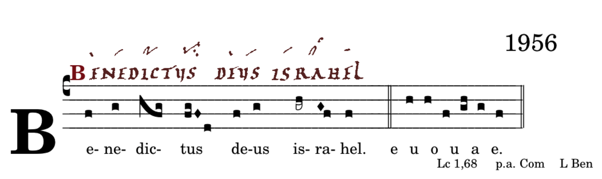 6INC triv Das „Benedictus“ kann nicht ganz schlicht komponiert sein. Statt nur vier Silben mit nur vier einfachen Tönen zu belegen, wird die gesamte Cento-Melodie verwendet (vgl.0504). Es entsteht ein Porrectus und ein Pes subpunctis.