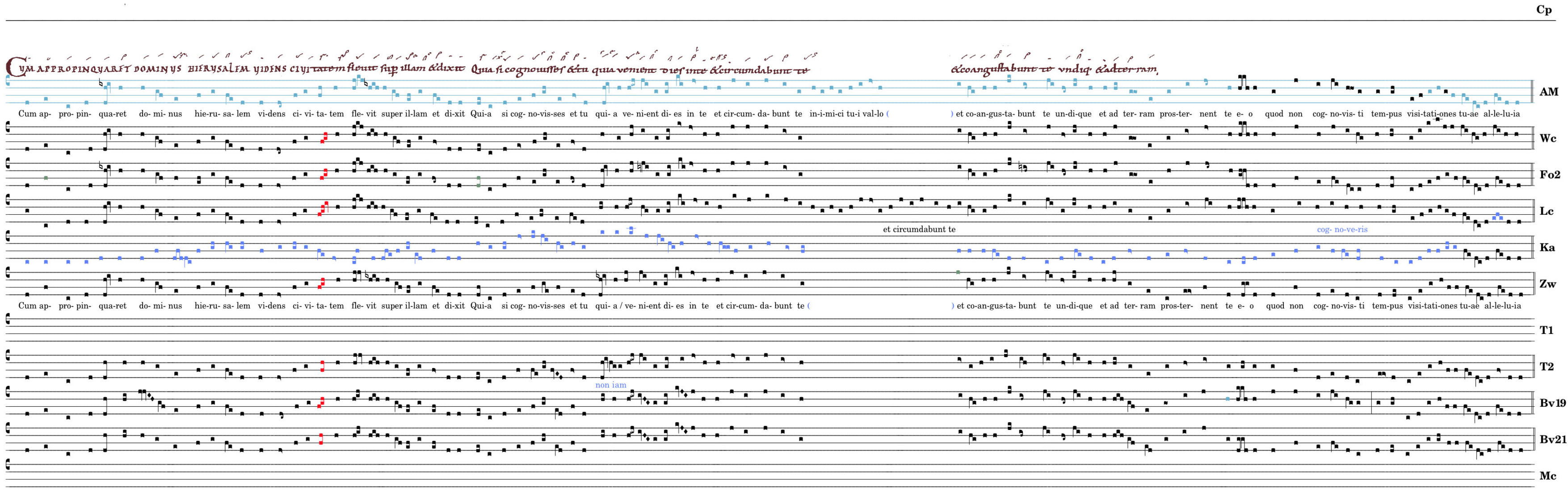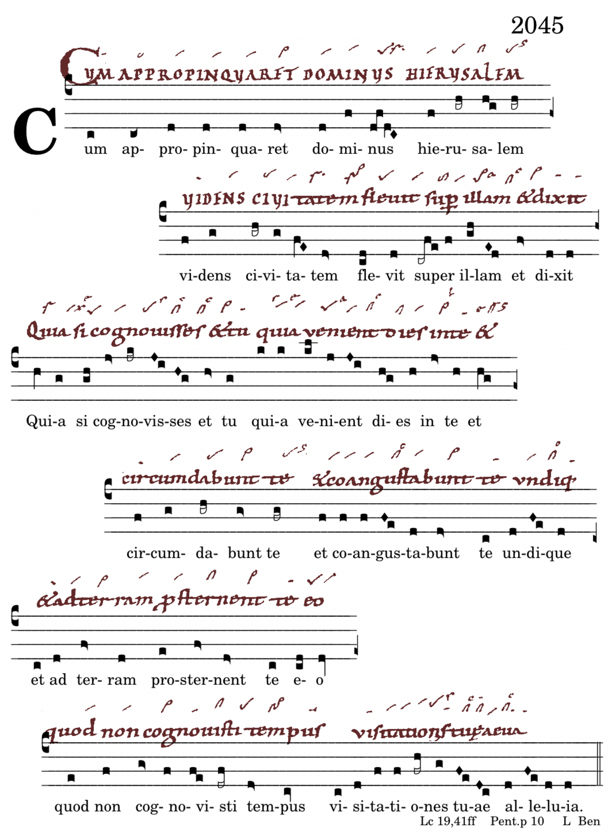Cum appropinquaret dominus / ierusalem videns civitatem / flevit super illam et dixit Quia si cognovisses et tu quia venient dies in te et circumdabunt te et coangustabunt te undique et ad terram / prosternent te eo / quod non cognovisti tempus / visitati ↔ ones tuae alleluia.