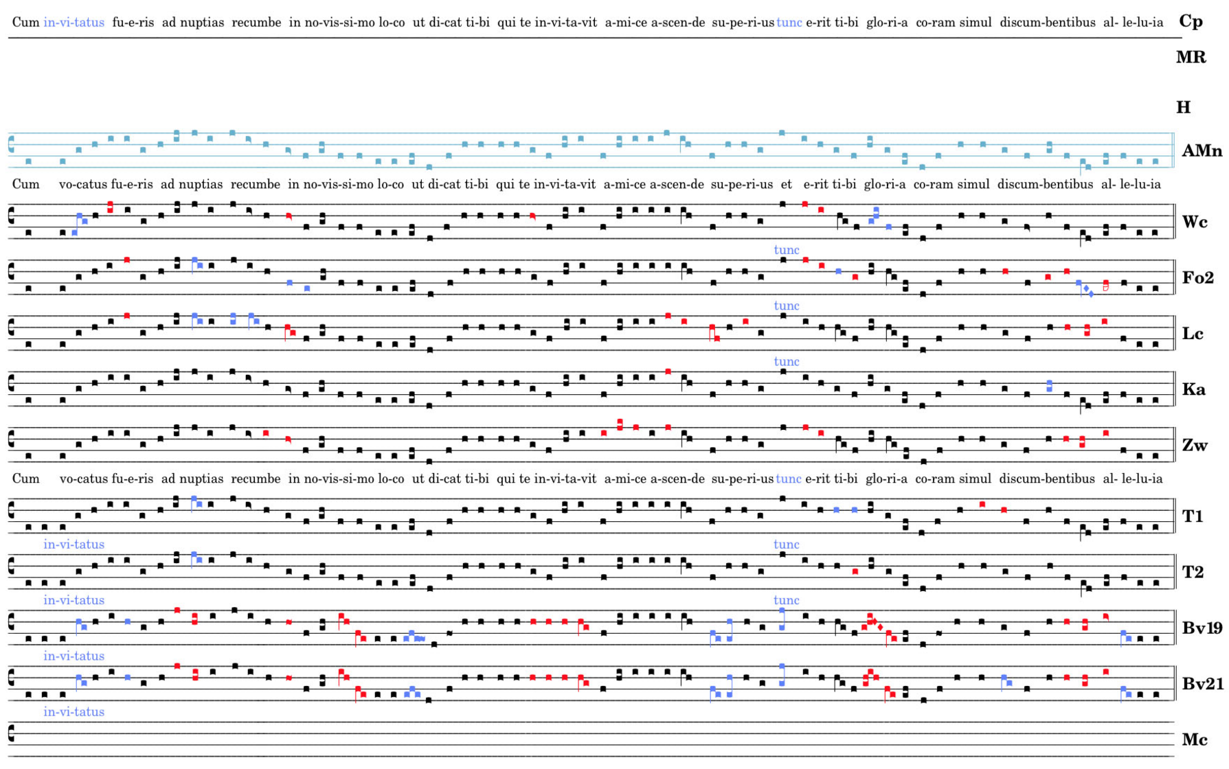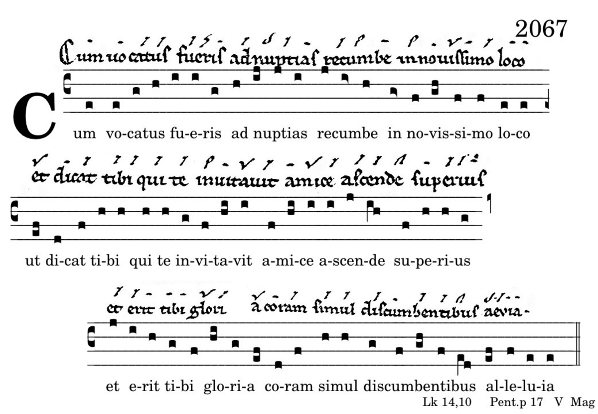 Cum vocatus fueris ad nuptias / recumbe in novissimo loco / et dicat tibi qui te invitavit / amice ascende superius / et erit tibi gloria coram simul / discumbentibus alleluia.