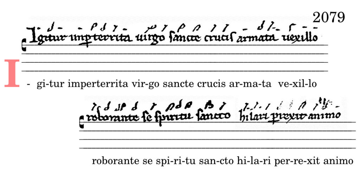 Igitur imperterrita virgo sancte crucis armata / vexillo roborante se spiritu sancto hilari perrexit animo.