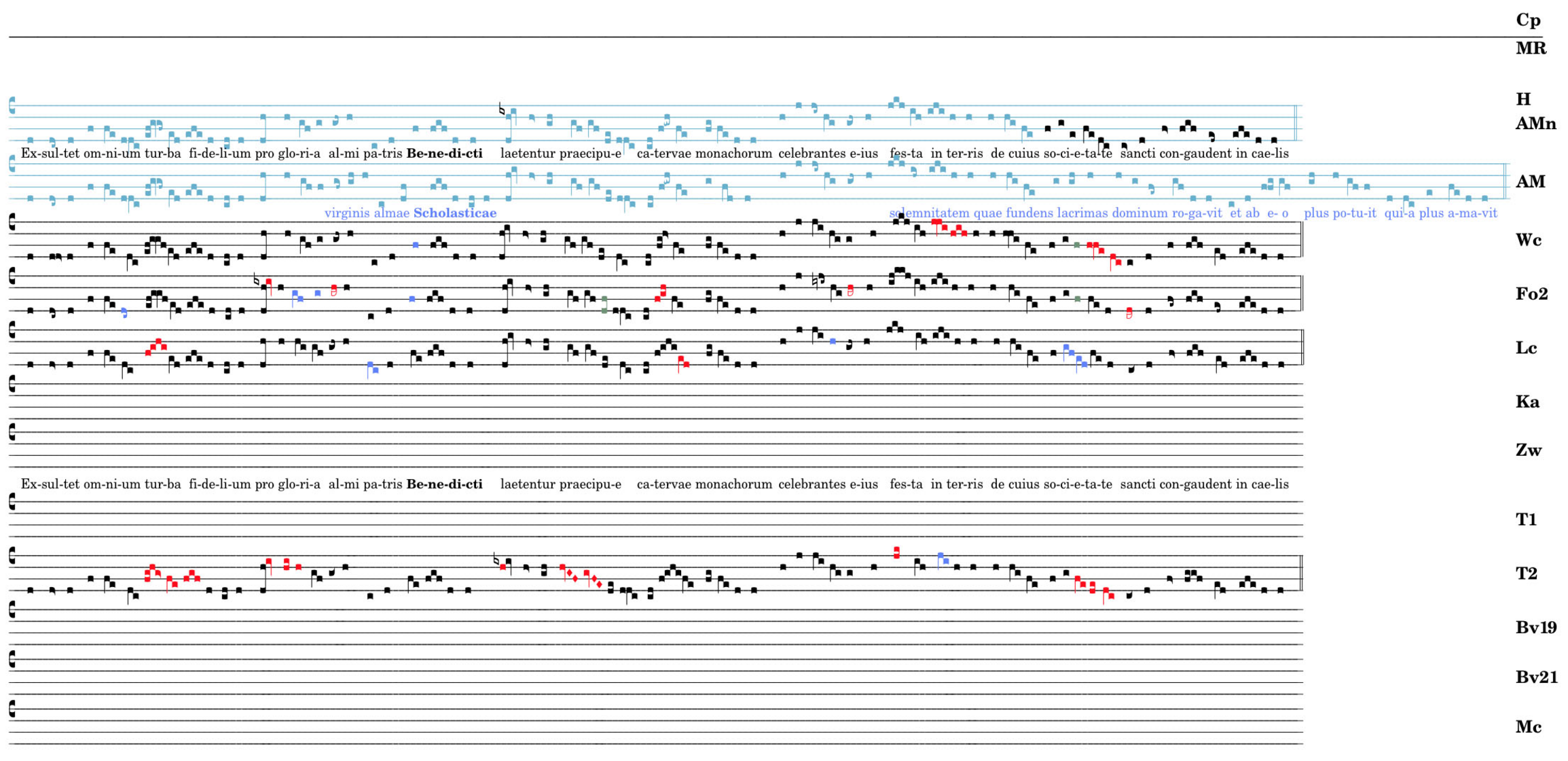 Exsultet omnium turba fidelium / pro gloria almi patris benedicti / laetentur praecipue catervae monachorum / celebrantes eius festa in terris / de cuius societate sancti congaudent in caelis.