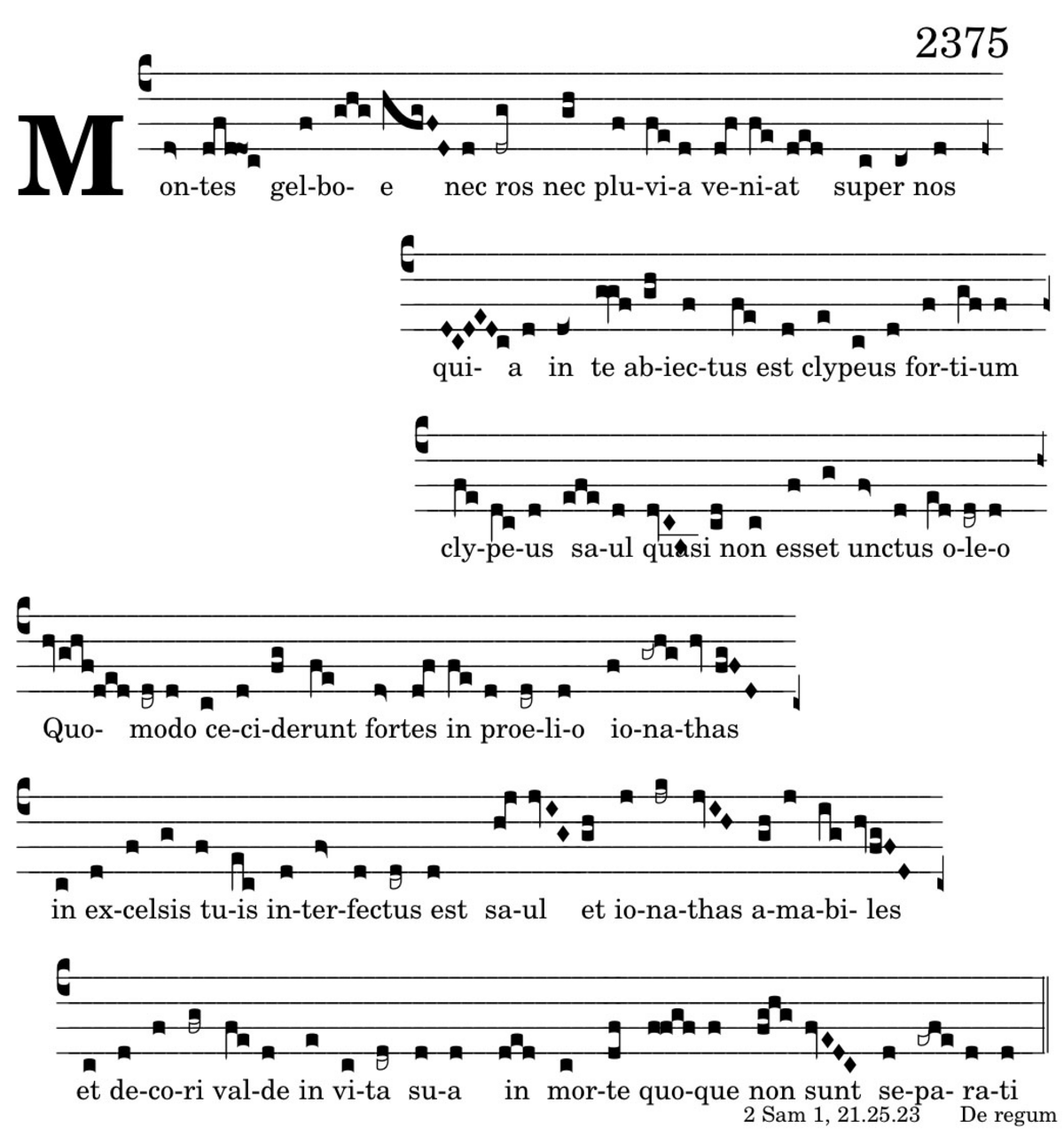 Montes gelboe nec ros nec pluvia veniat super nos / quia in te abiectus est clypeus fortium / clypeus saul quasi non esset unctus oleo ( quomodo ceciderunt fortes in proelio ionathas / in excelsis tuis interfectus est / saul et ionathas amabiles / et decori valde in vita sua / in morte quoque non sunt separati.