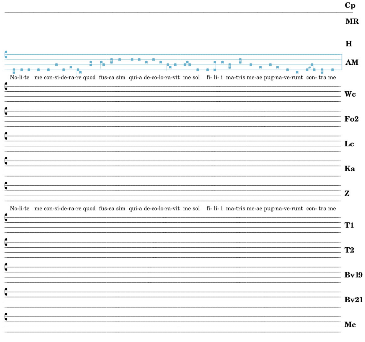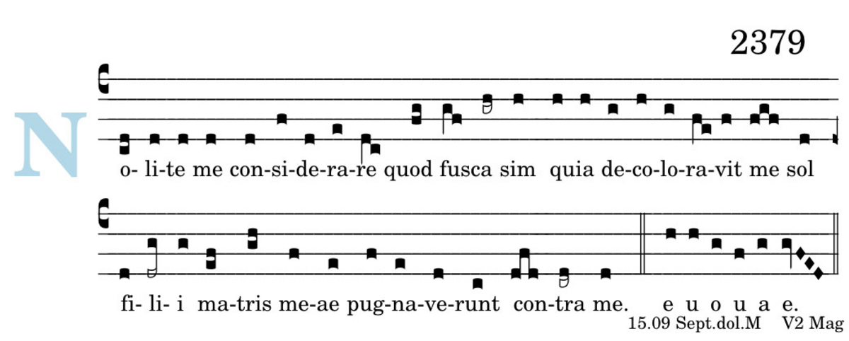 Nolite me considerare / quod fusca sim / quia decoloravit me sol / filii matris meae pugnaverunt contra me.