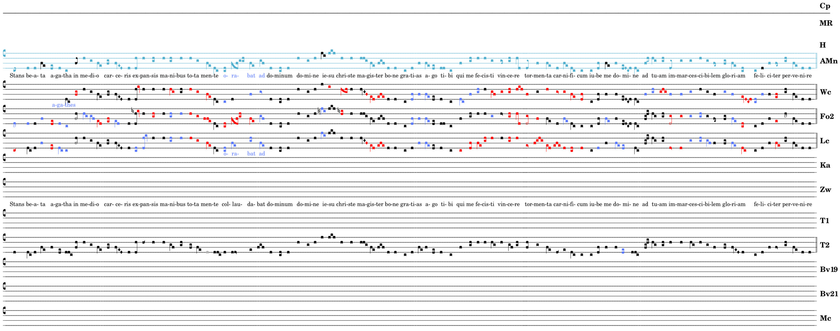 Stans beata agatha in medio carceris/ expansis manibus tota mente / orabat ad dominum / domine iesu christe magister bone / gratias ago tibi / qui me fecisti vincere tormenta carnificum / iube me domine / ad tuam immarcescibilem gloriam / feliciter pervenire.