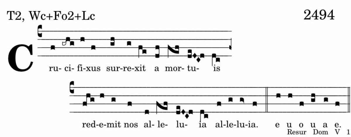 Cruxifixus surrexit / a mortuis / et redemit nos / alleluia alleluia.