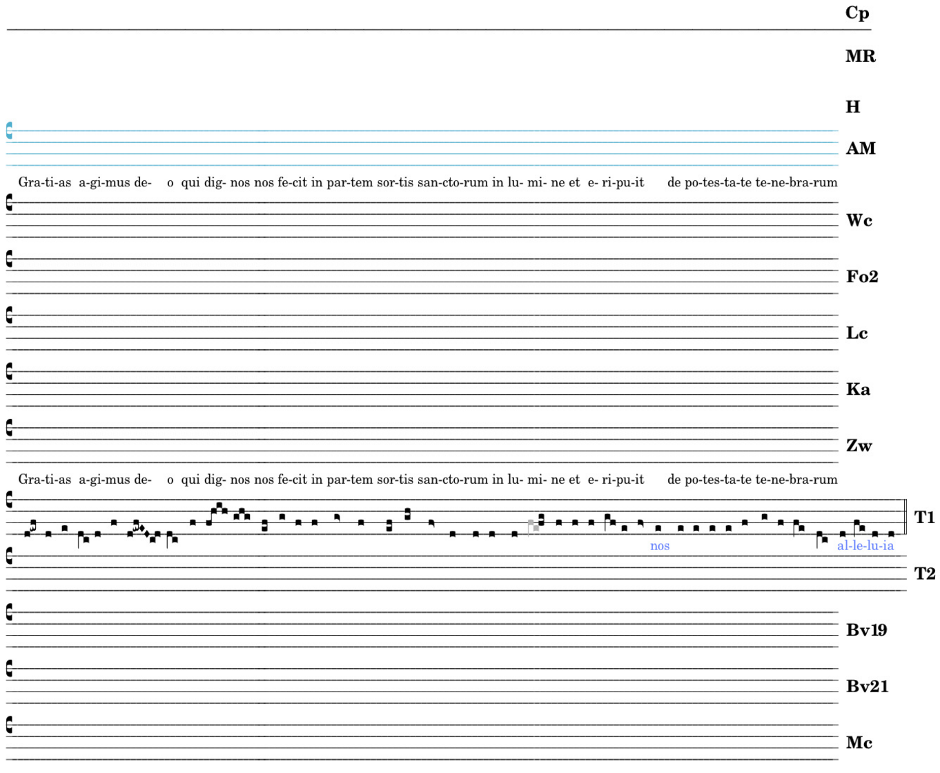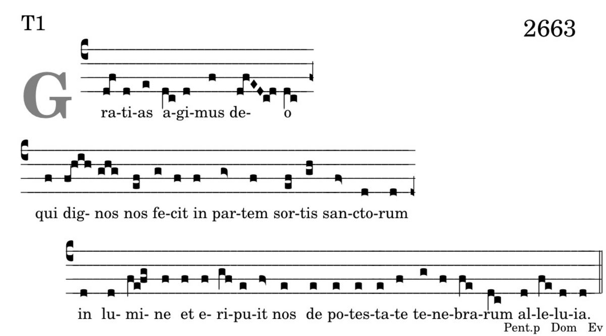 Gratias agimus deo / qui dignos nos fecit in partem / sortis sanctorum / in lumine et eripuit de potestate / tenebrarum alleluia.