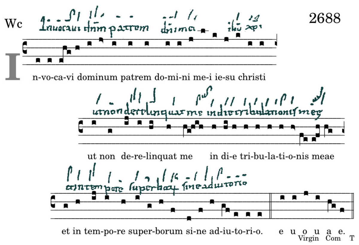 Invocavi dominum patrem / domini mei iesu christi / ut non derelinquat me / in die tribulationis meae / et in tempo- ↔ re superborum / sine adiutorio.