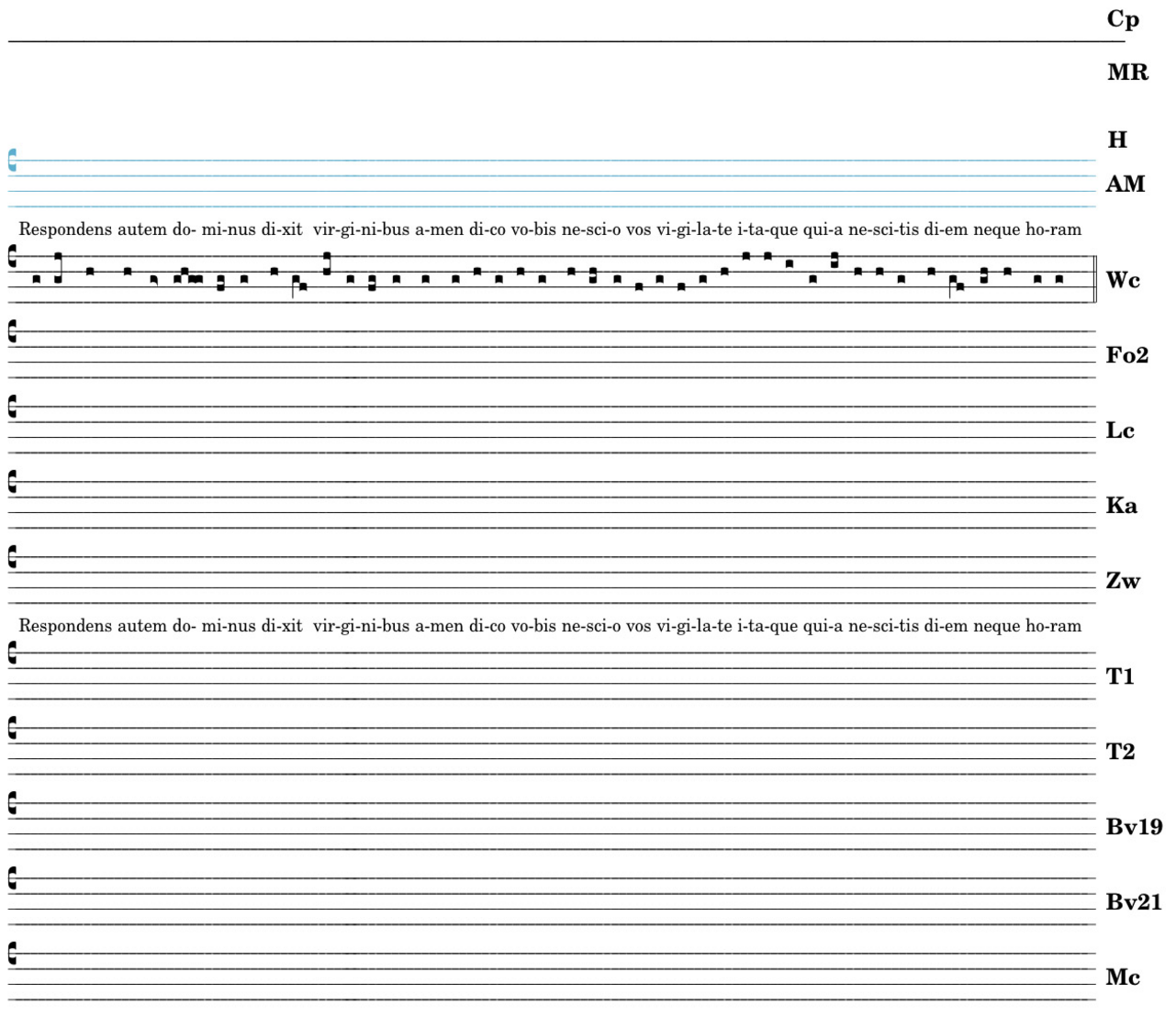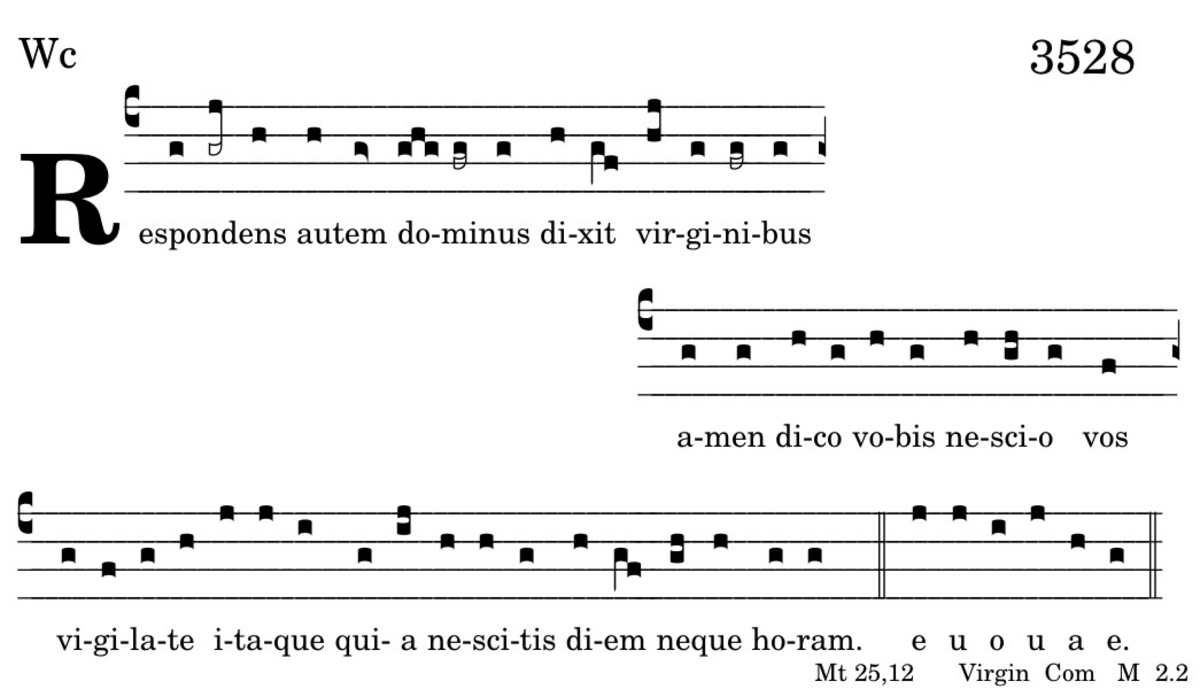 Respondens autem dominus / dixit virginibus / amen dico vobis nescio vós / vigilate itaque / quia nescitis / diem neque horam.