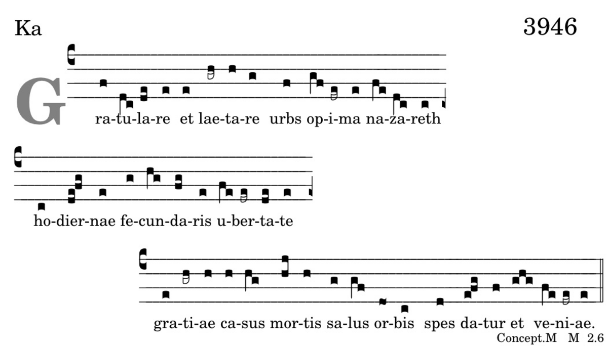 Gratulare et laetare / urbs optima nazareth / hodiernae fecundaris / ubertate gratiae / casus mortis salus orbis / spes datur et veniae. ../. ../. /.../..