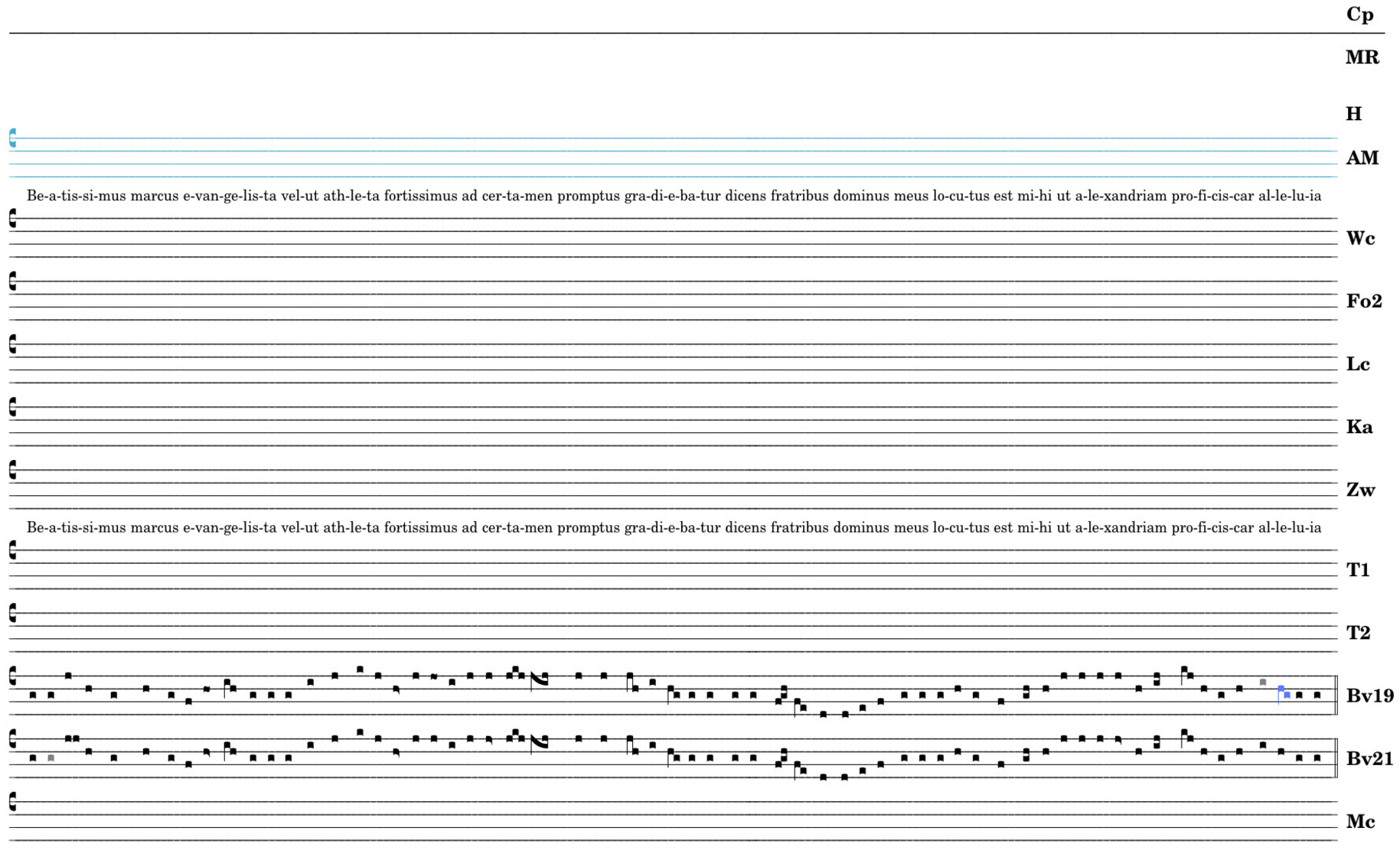 Beatissimus marcus evangelista / velut athleta fortissimus / ad certamen → promptus gradiebatur . dicens fratribus / dominus meus / locutus est mihi / ut alexandriam proficis ↔ car alleluia.