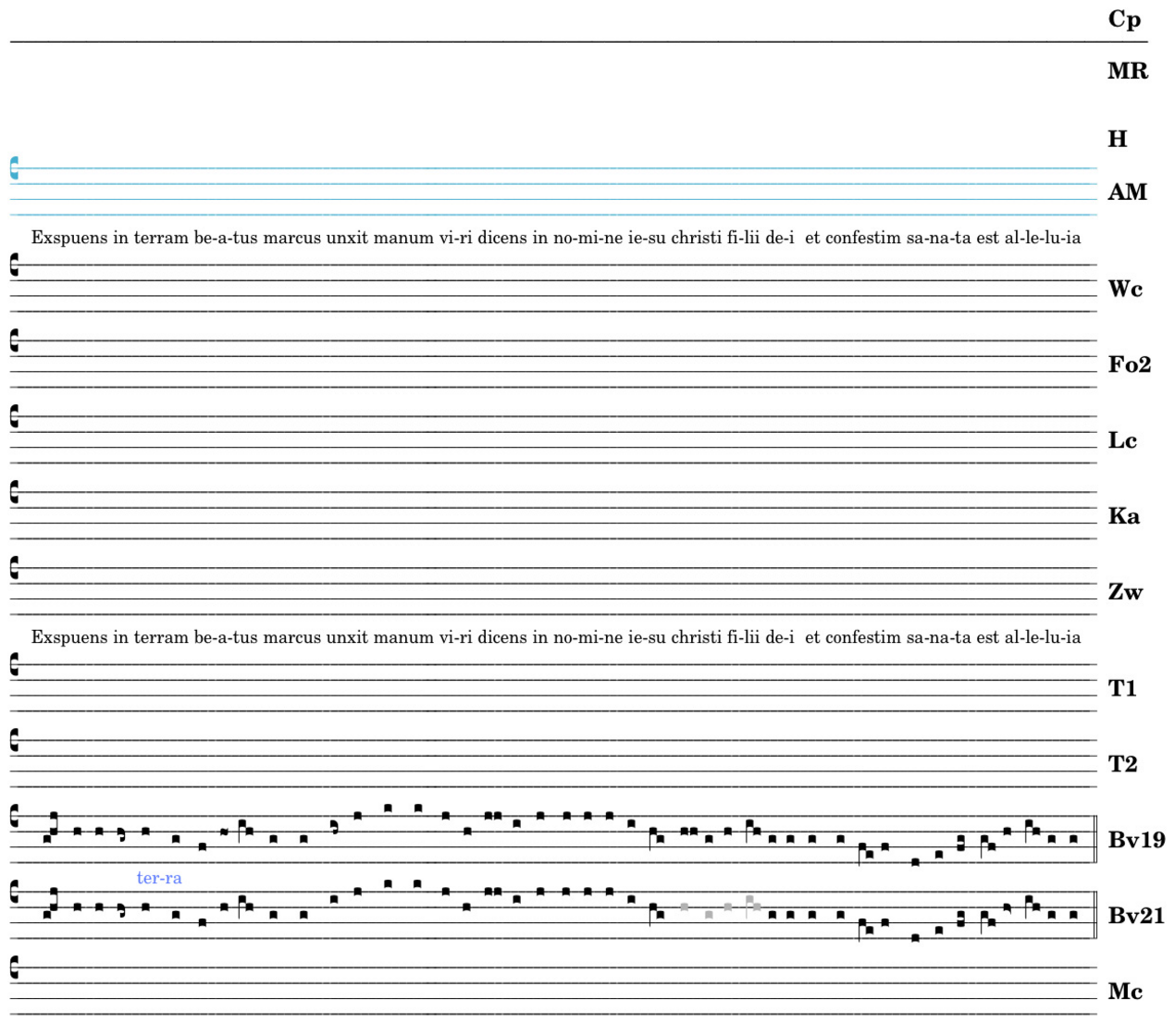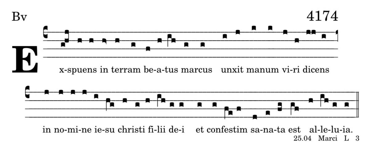 Exspuens in terram beatus marcus / unxit manum viri dicens / in nomine iesu christi filii dei / et confestim sanata est / alleluia.