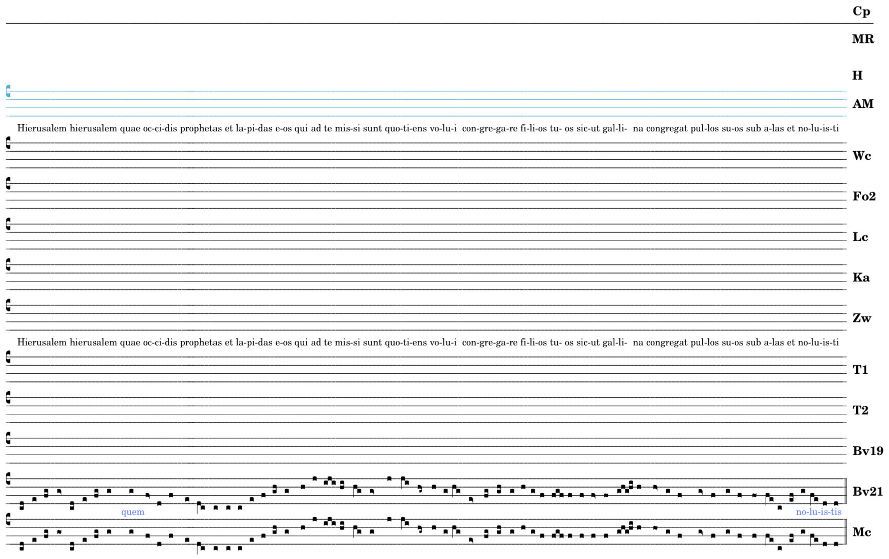 Hierusalem / hierusalem / quae occidis prophetas / et lapidas eos / qui ad te missi sunt ! quotiens volui / congregare filios tuos / sicut gallina / congregat pullos suos sub alas / et noluisti.