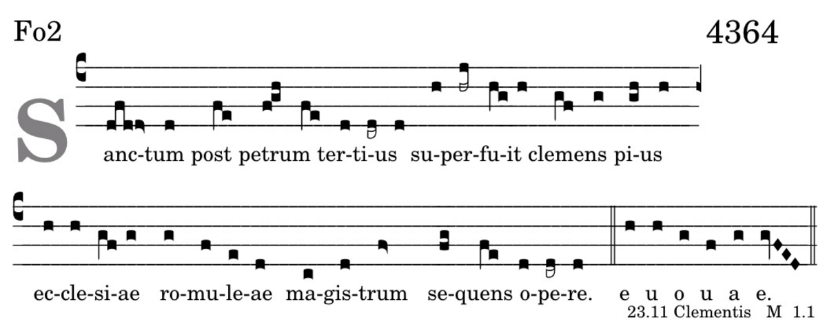 Sanctum post petrum tertius / superfuit clemens pius / ecclesiae romuleae / magistrum sequens opere.