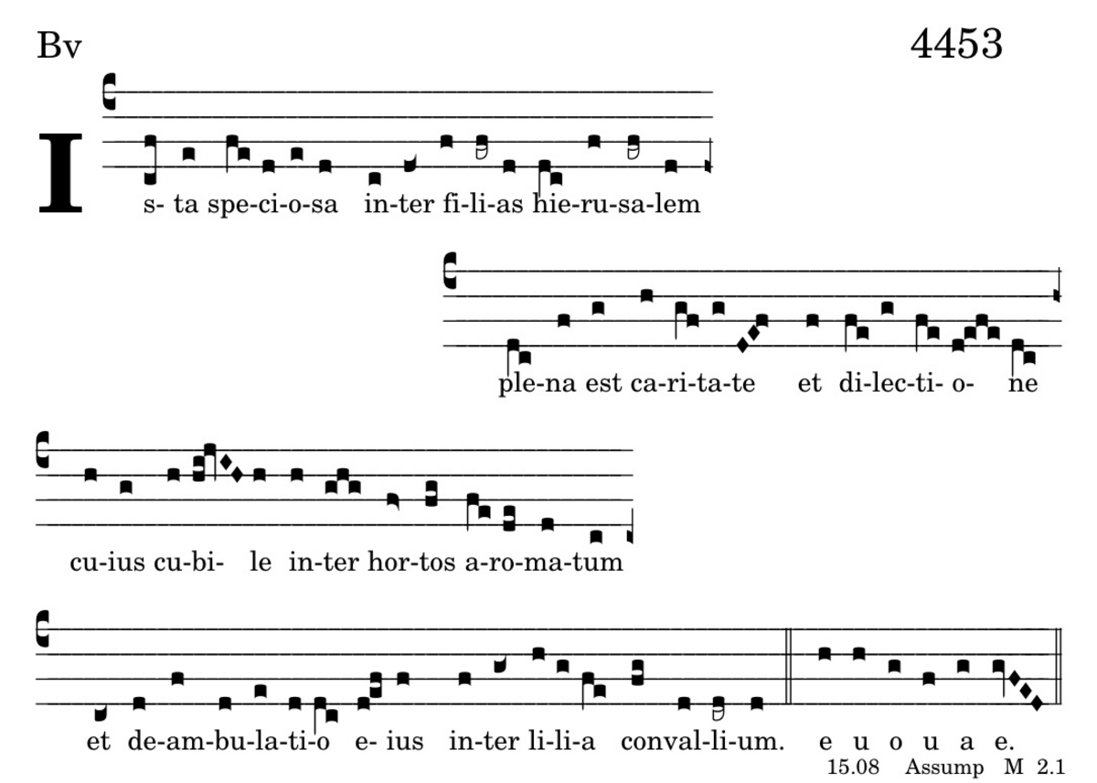 Ista speciosa / inter filias hierusalem / plena est caritate / et dilectione / cuius cubile inter hortos aromatum / et deambulatio eius / inter lilia convallium.