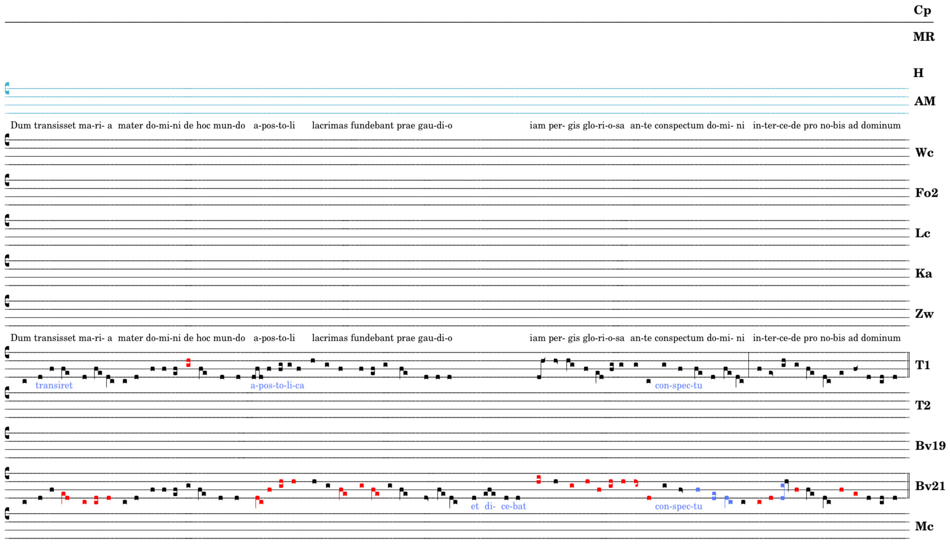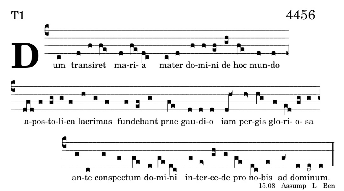 Dum transiret maria / mater domini de hoc mundo / apostoli lacrimas fundebant prae gaudio / iam pergis gloriosa / ante conspectum domini / intercede pro nobis ad dominum.