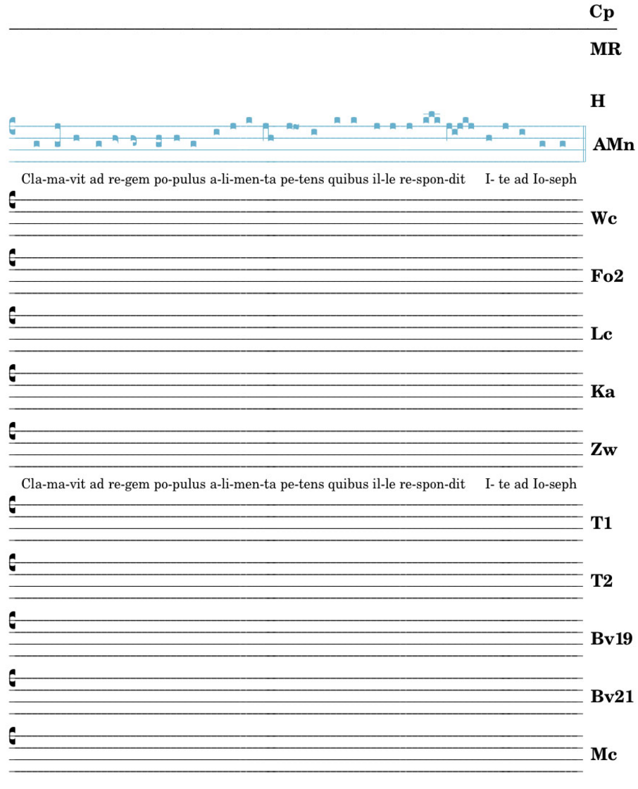 Clamavit ad regem populus / alimenta petens / quibus ille respondit / ite ad ioseph.