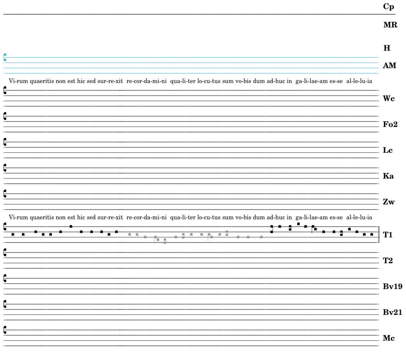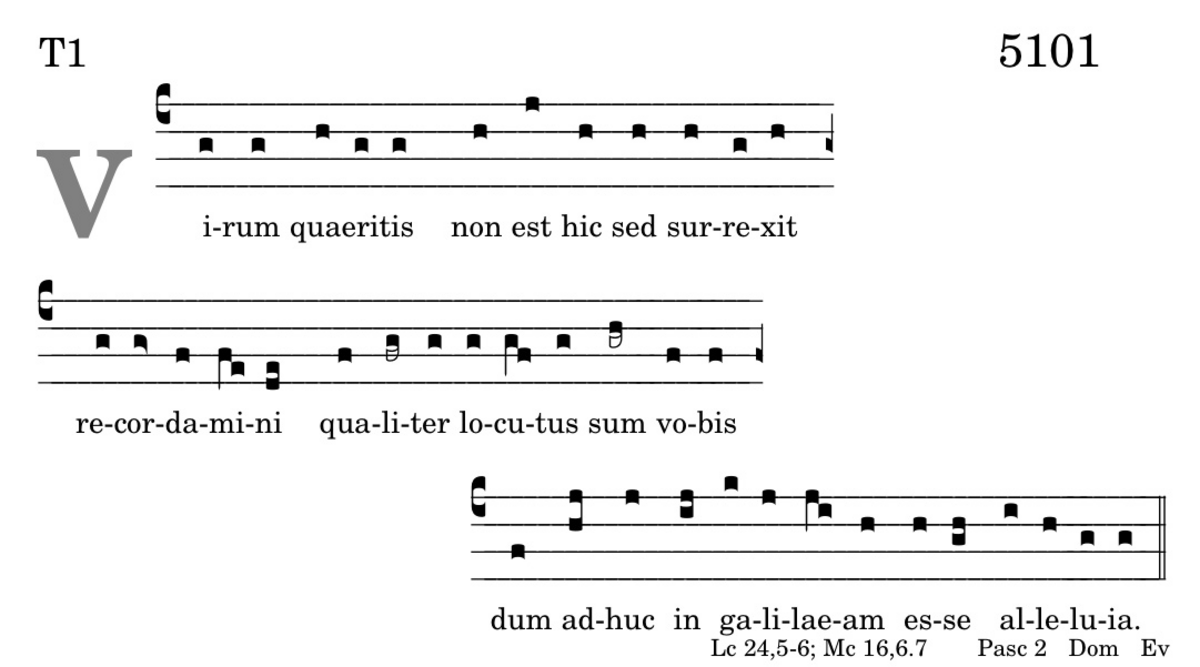 Virum quáeritis / non est hic sed surrexit / recordamini / qualiter locutus sum vobis : dum adhuc in galilaeam / esse alleluia.