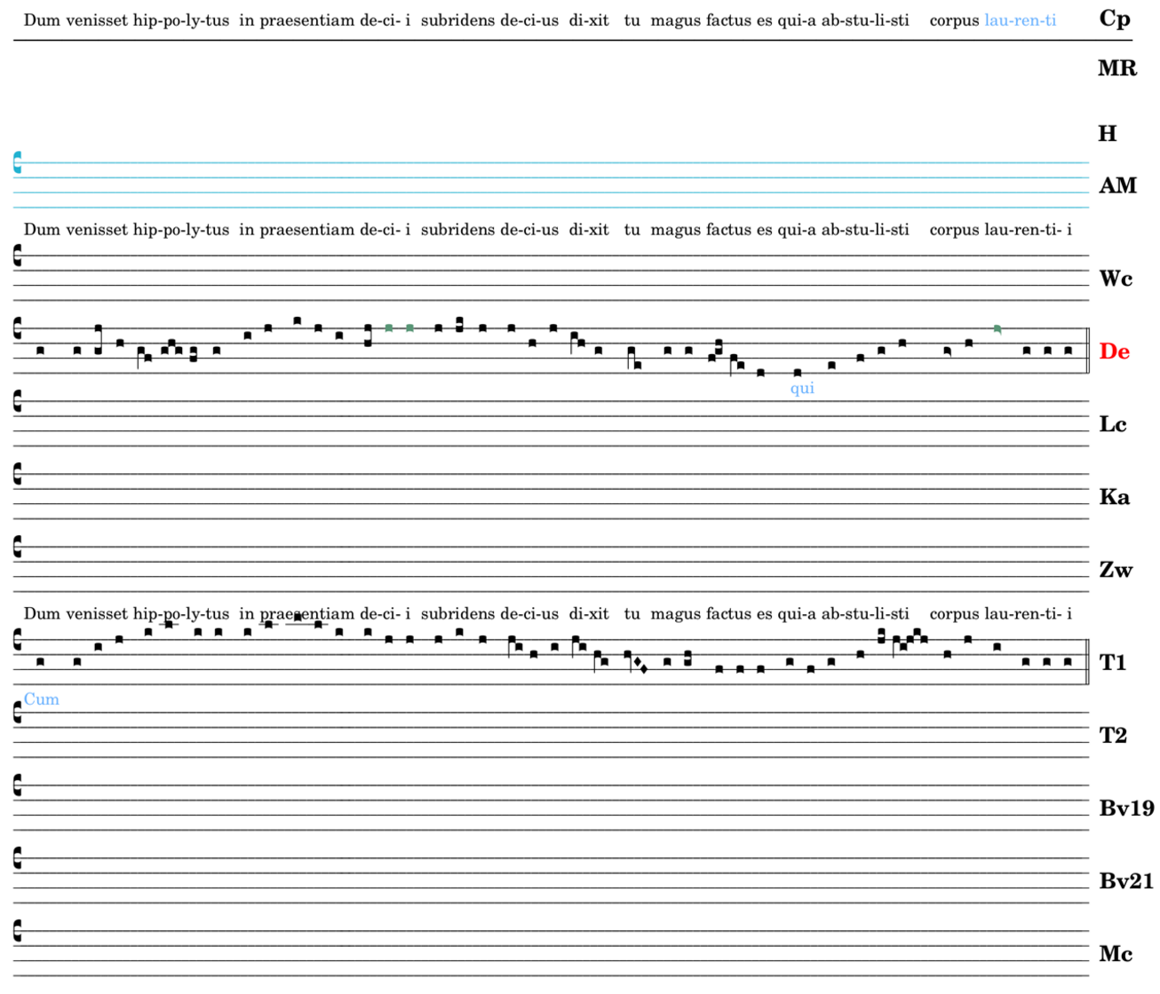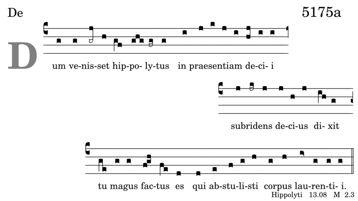 Dum venisset hippolytus / in praesentiam decii / subridens decius dixit / tu magus factus es qui abstulisti / corpus laurentii.