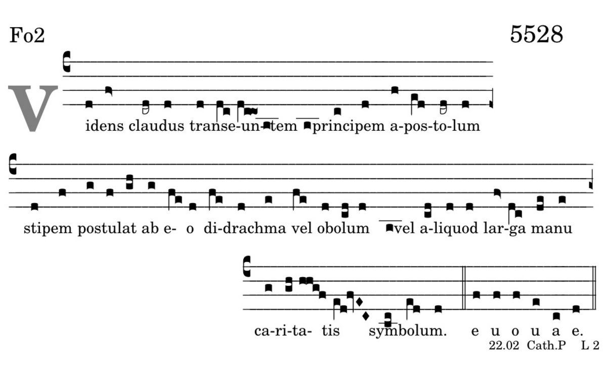 Videns claudus transeuntem principem apostolum / stipem postulat ab eo / didrachma vel obolum / vel aliquod larga manu / caritatis symbolum.