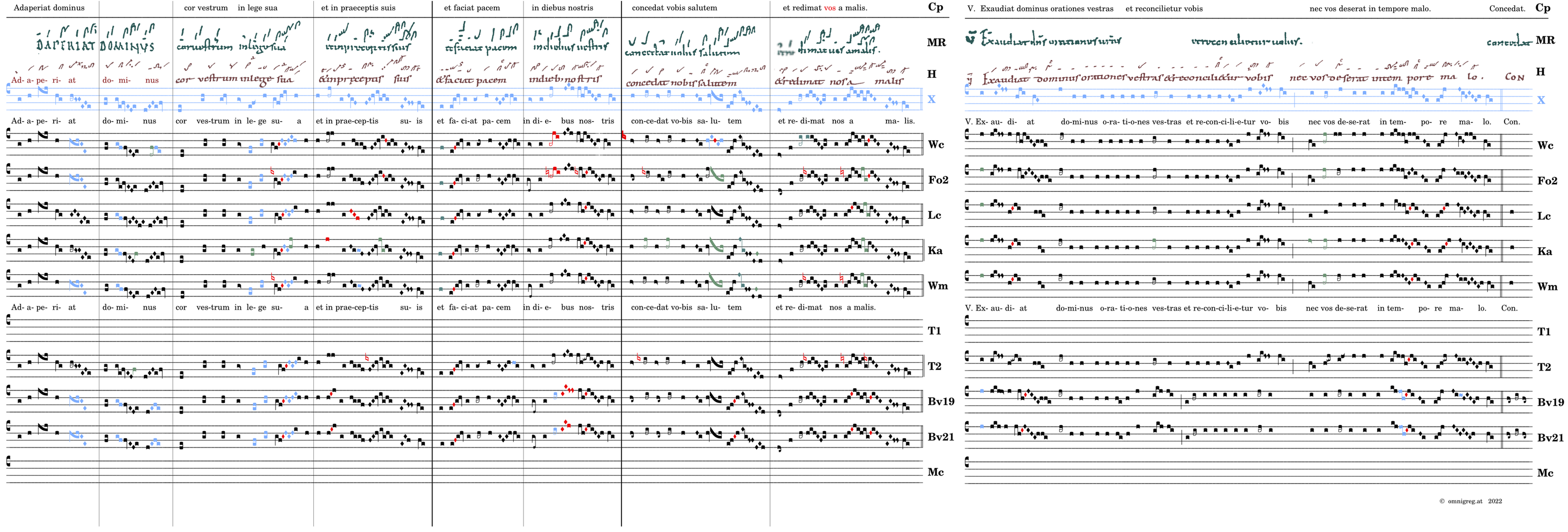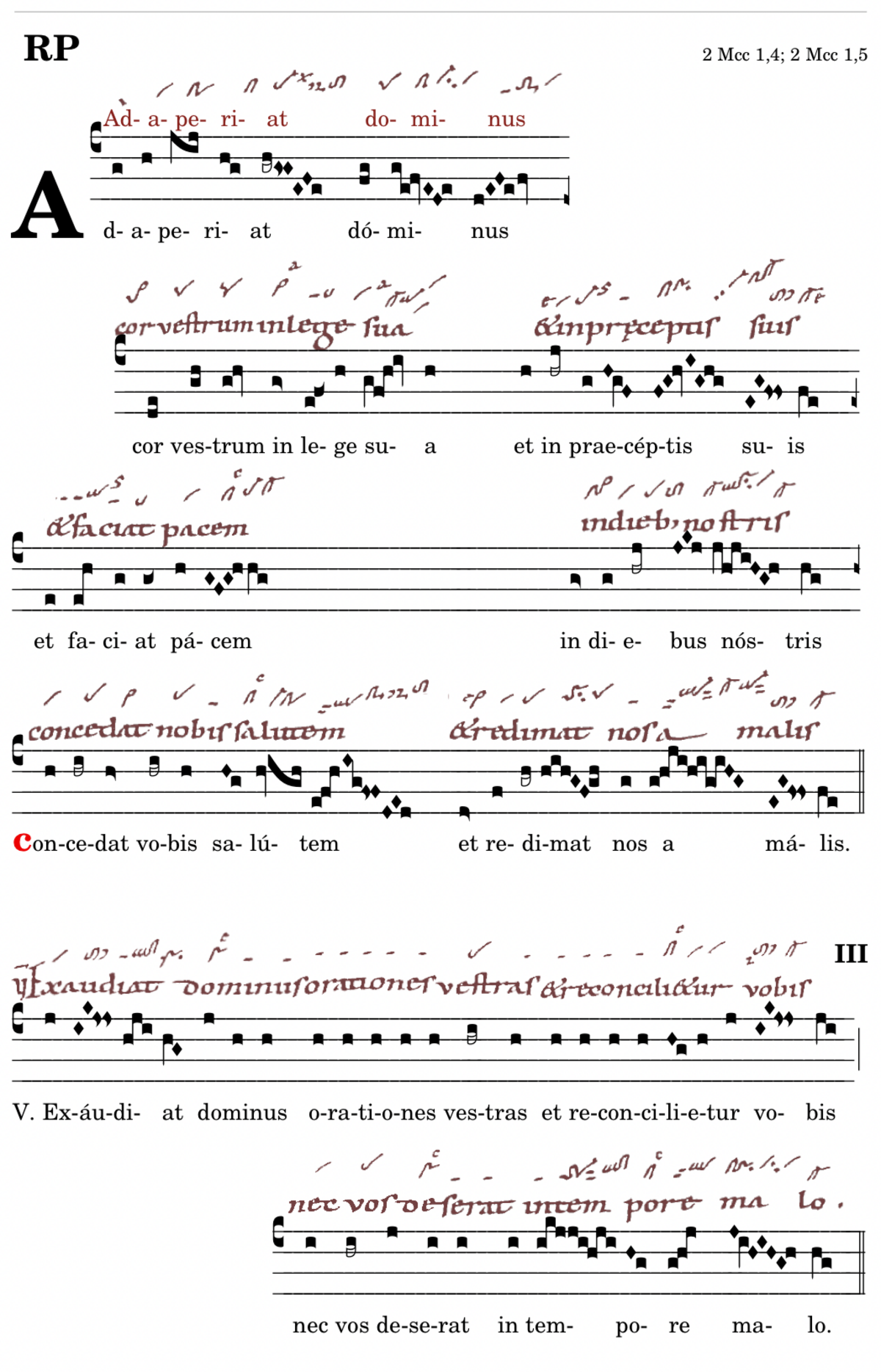 Adaperiat / dominus / cor vestrum in lege sua / et in praeceptis suis / et faciat pacem / in diebus nostris (-vestris) / 📍Concedat vobis salutem / et redimat vos a malis. V. Exaudiat dominus orationes vestras et reconciiietur vobis* nec vos deserat in tempore malo.