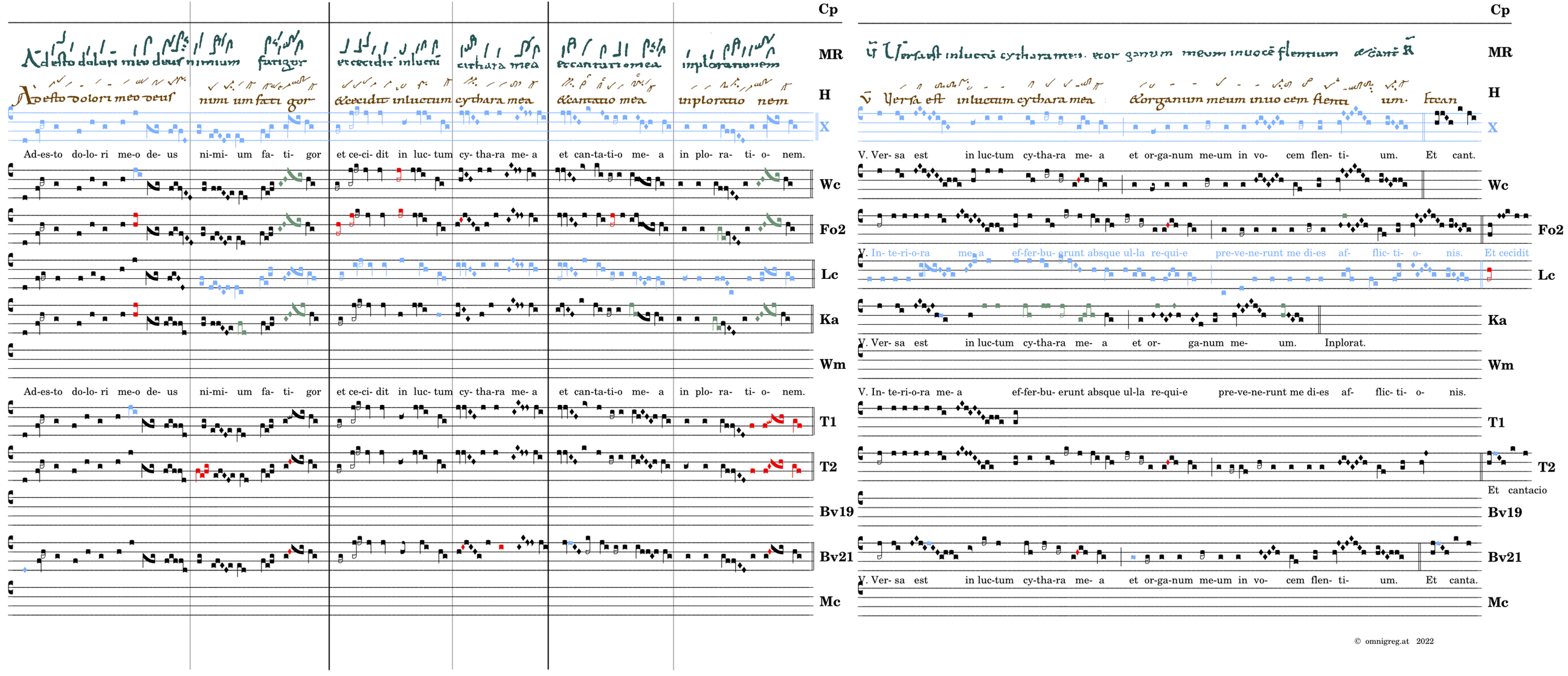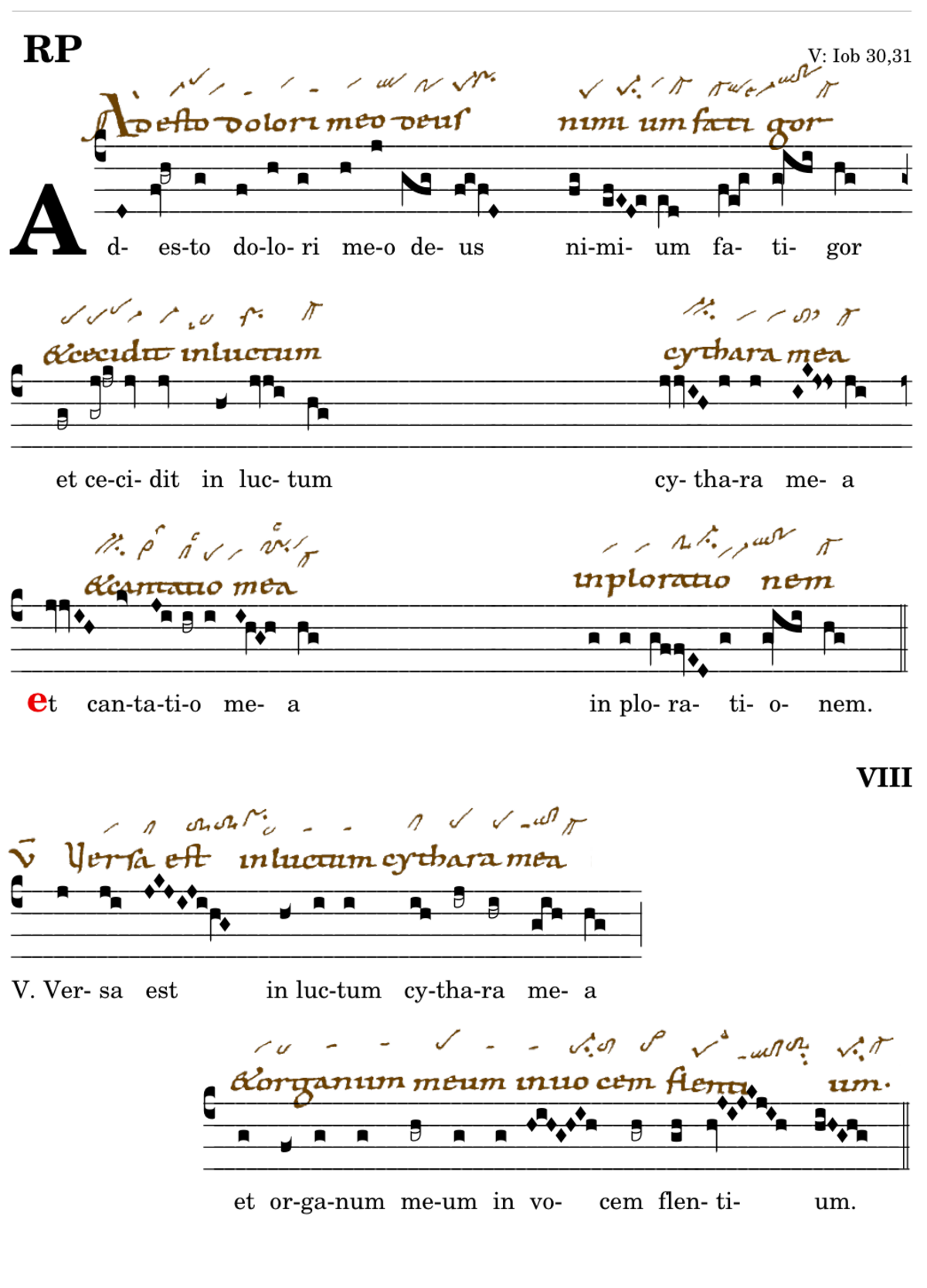Adesto dolori meo deus nimium fatogor / et cecidit in luctum cythara mea / 📍Et cantatio mea in plorationem. V. Versa est in luctum cythara mea / et organum meum in vocem flentium. (Fo2,Lc,Tol) V. Interiora mea efferbuerunt absque ulla requie preaevenerunt me dies afflictionis.