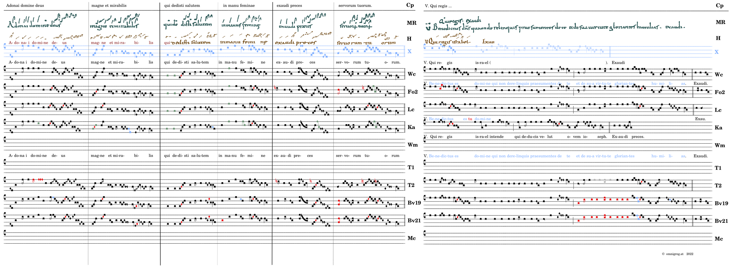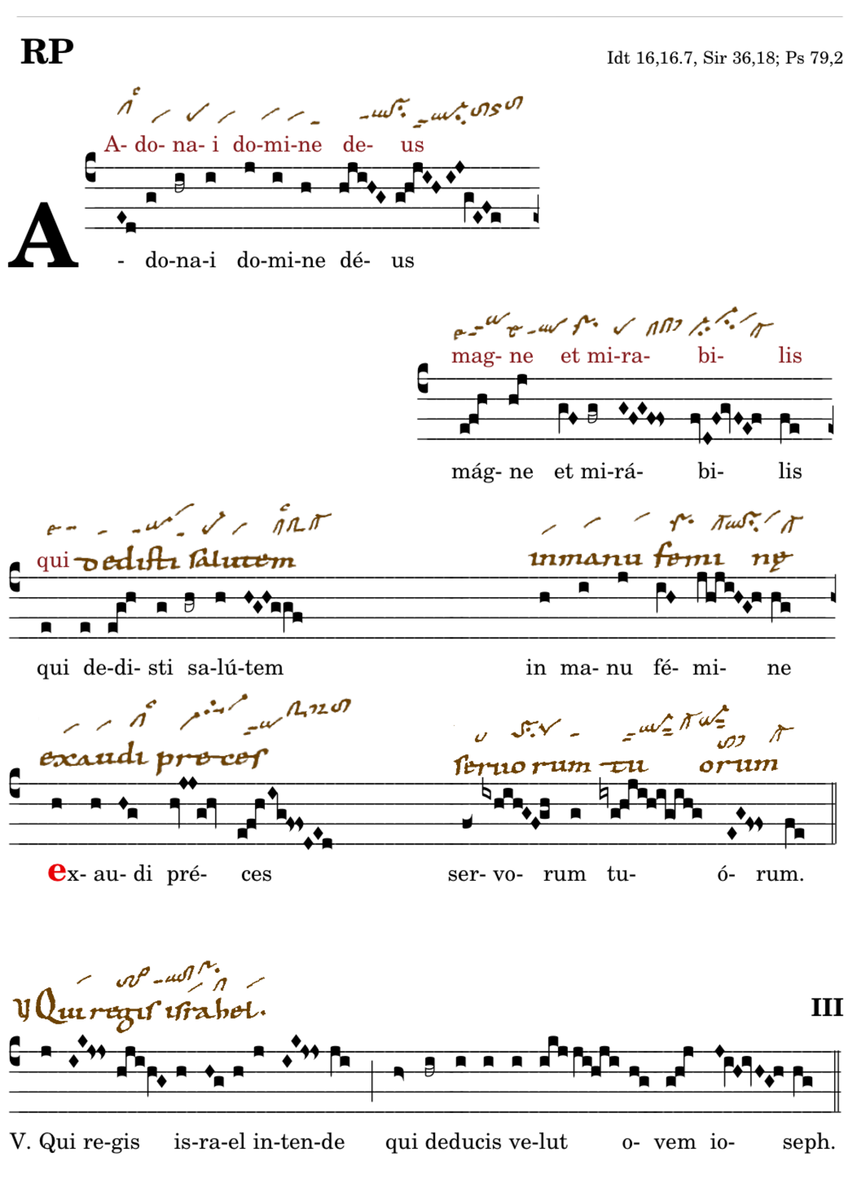 Adonai domine deus / magne et mirabilis / qui dedisti salutem / in manu femine / 📍Exaudi preces / servorum tuorum. V. Benedictus es domine qui non derelinquis praesumentes de te* et de sua virtute gloriantes humilias. (omnes) V. Benedictus es domine qui non derelinquis praesumentes de te / et de sua virtute gloriantes humilias.