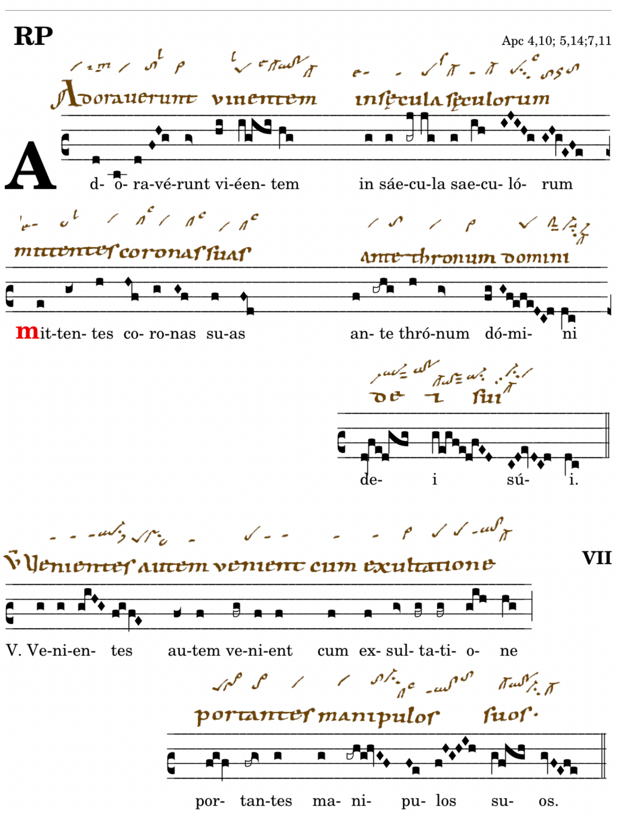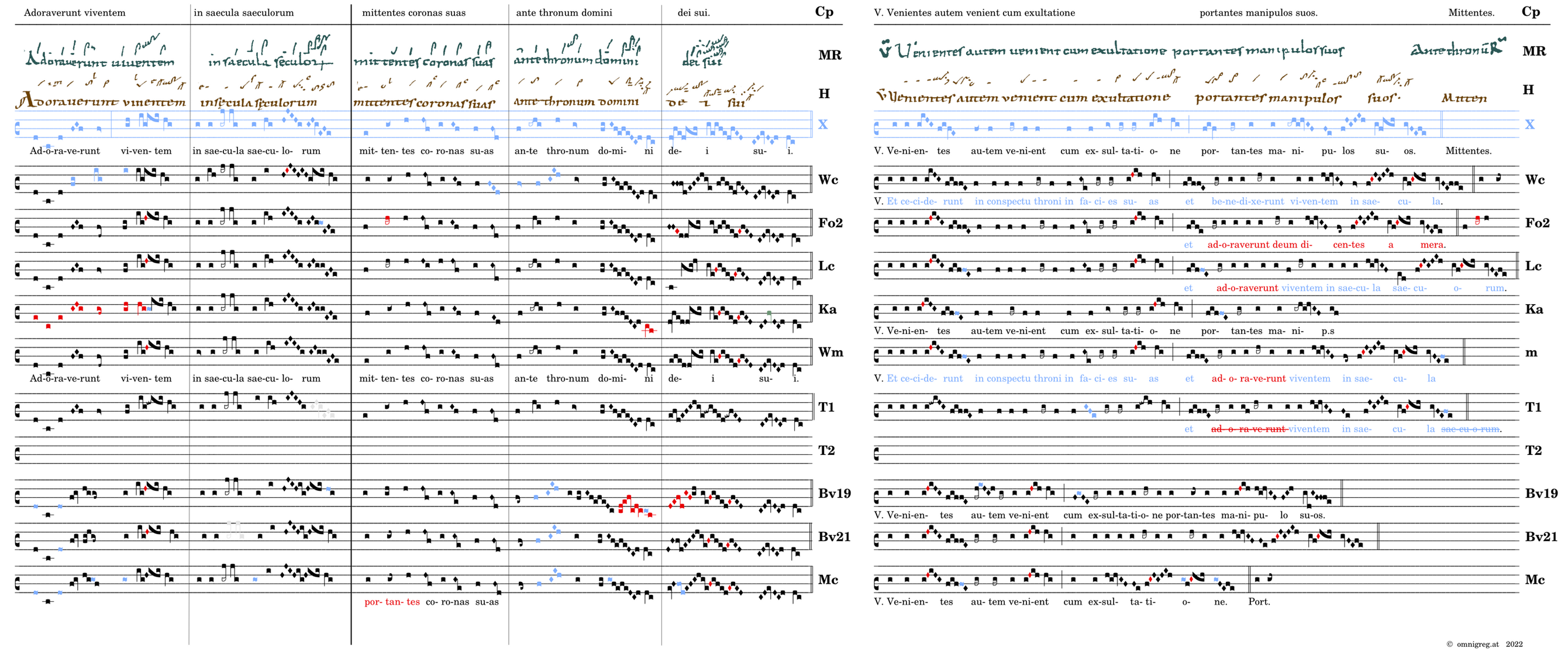 Adoraverunt viventem / in saecula saeculorum / 📍Mittentes (📍-portantes) coronas suas / 📍ante thronum domini / dei sui. V. Venientes autem venient cum exultatione* portantes manipulos suos. (Wc,Lc,Wm,T1) V.Et ceciderunt in conspectu throni in facies suas / et adoraverunt viventem in saecula(saeculorum). (Fo2) V.Et ceciderunt in conspectu throni in facies suas et adoraverunt deum dicentes ...