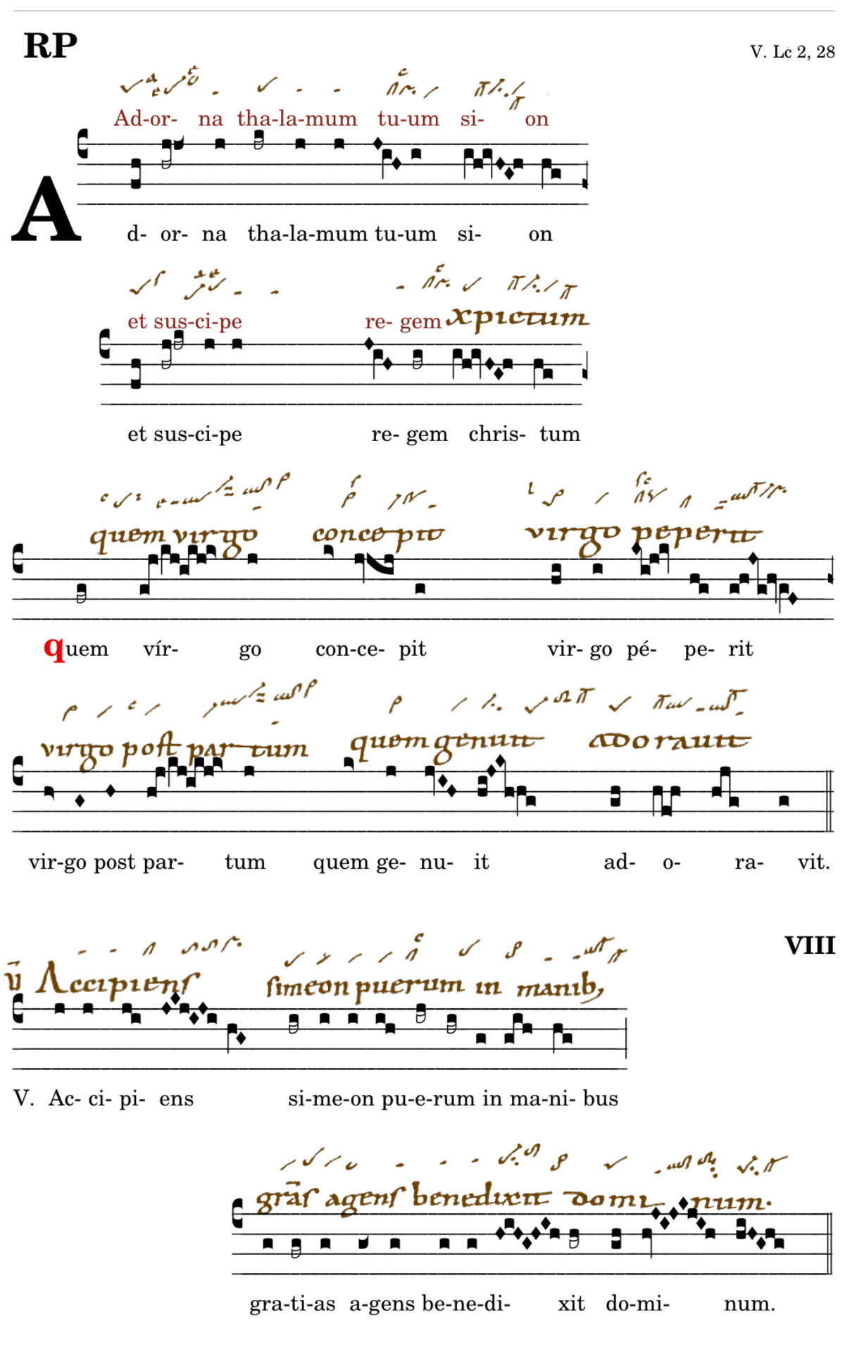 Adorna thalamum tuum sion / et suscipe regem christum / 📍Quem virgo concepit / virgo peperit / virgo post partum / quem genuit / adoravit. V. Accipiens simeon puerum in manibus* gratias agens benedixit dominum. (Wm,Tol,Bv,Mc) V. Induere vestimentis gloriae tuae civitas sancti.