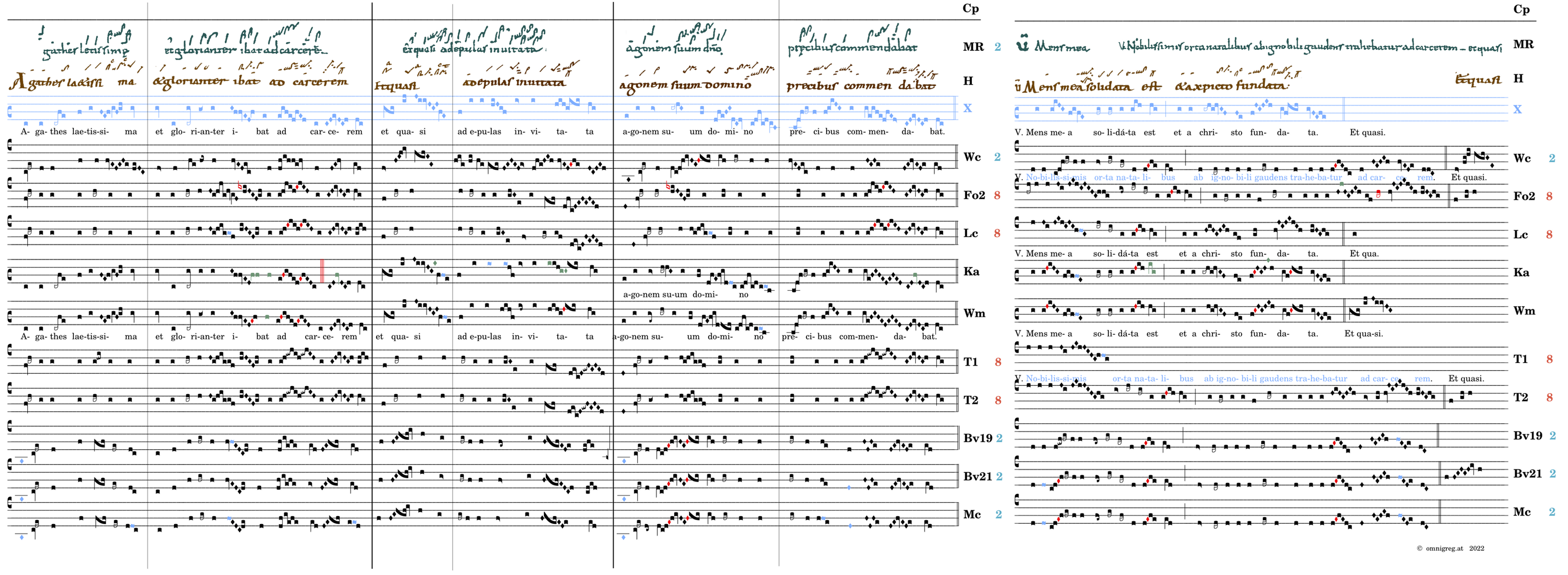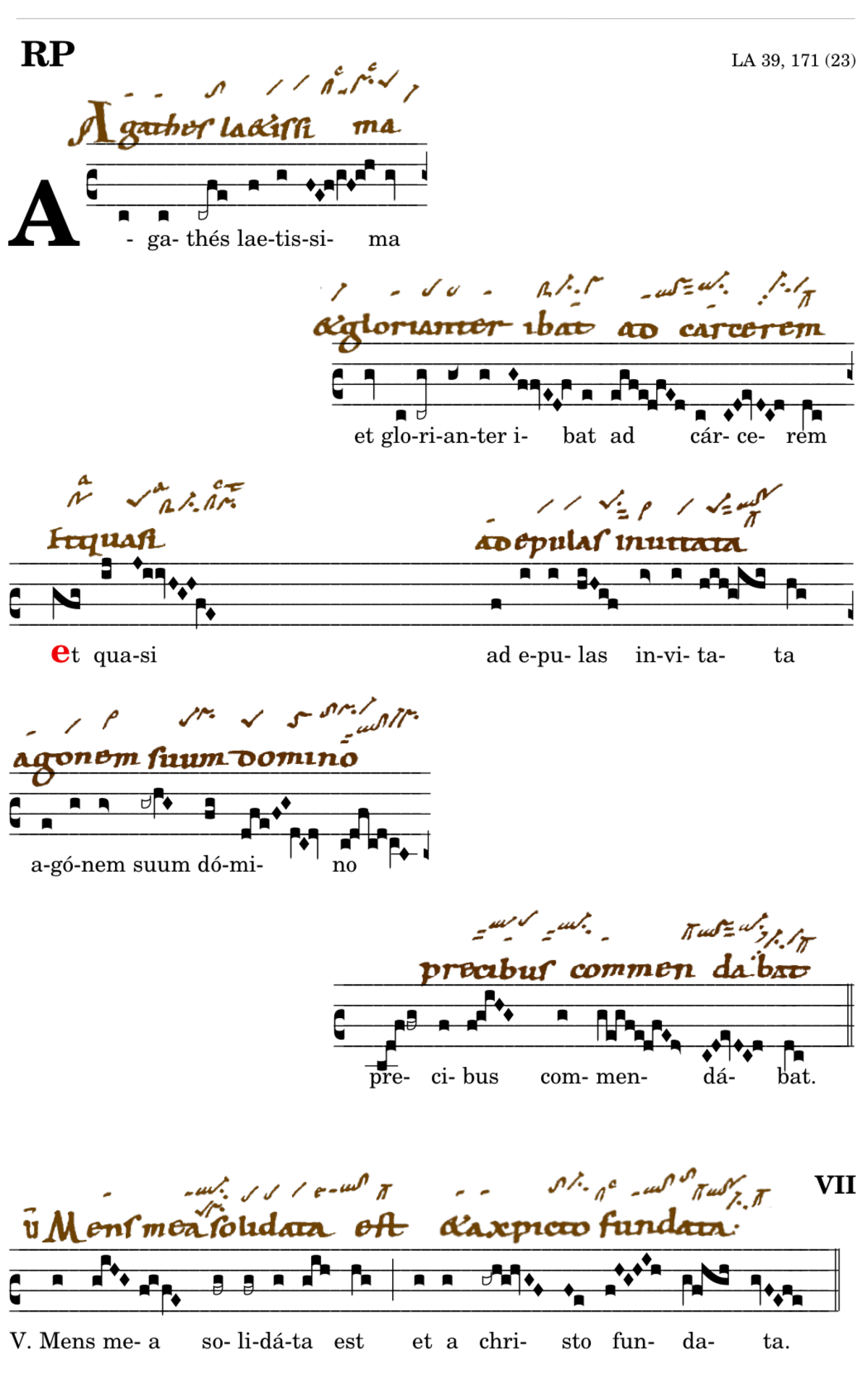 Agathes laetissima et glorianter / ibat ad carcerem / 📍Et quasi / ad epulas invitata / agonem suum domino / precibus commendabat. V. Mens mea solidata est* et a christo fundata. (MR,Fo2,Tol,Bv,Mc) V.Nobilissimis orta natalibus ab ignobili gaudens trahebatur ad carcerem.