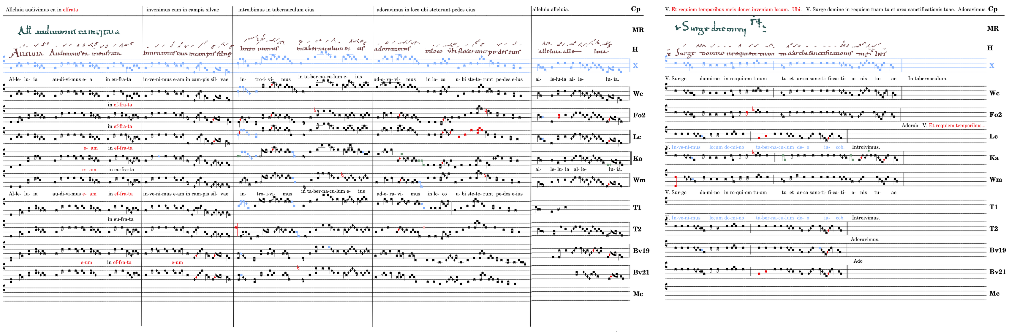 Alleluia / audivimus ea in eufrata / inveniemus eam / in campis selvae 📍introivimus 📍In tabernaculum eius 📍adoravimus / in loco 📍ubi flexerunt pedes eius / alleluia alleluia. V. Surge domine in requiem tuam* tu et arca sanctificationis tuae. (Fo2,Lc,Tol,Bv) V. Invenimus locum domino tabernaculum deo iacob. (Cp) V. Et requiem temporibus meis donec inveniam locum.