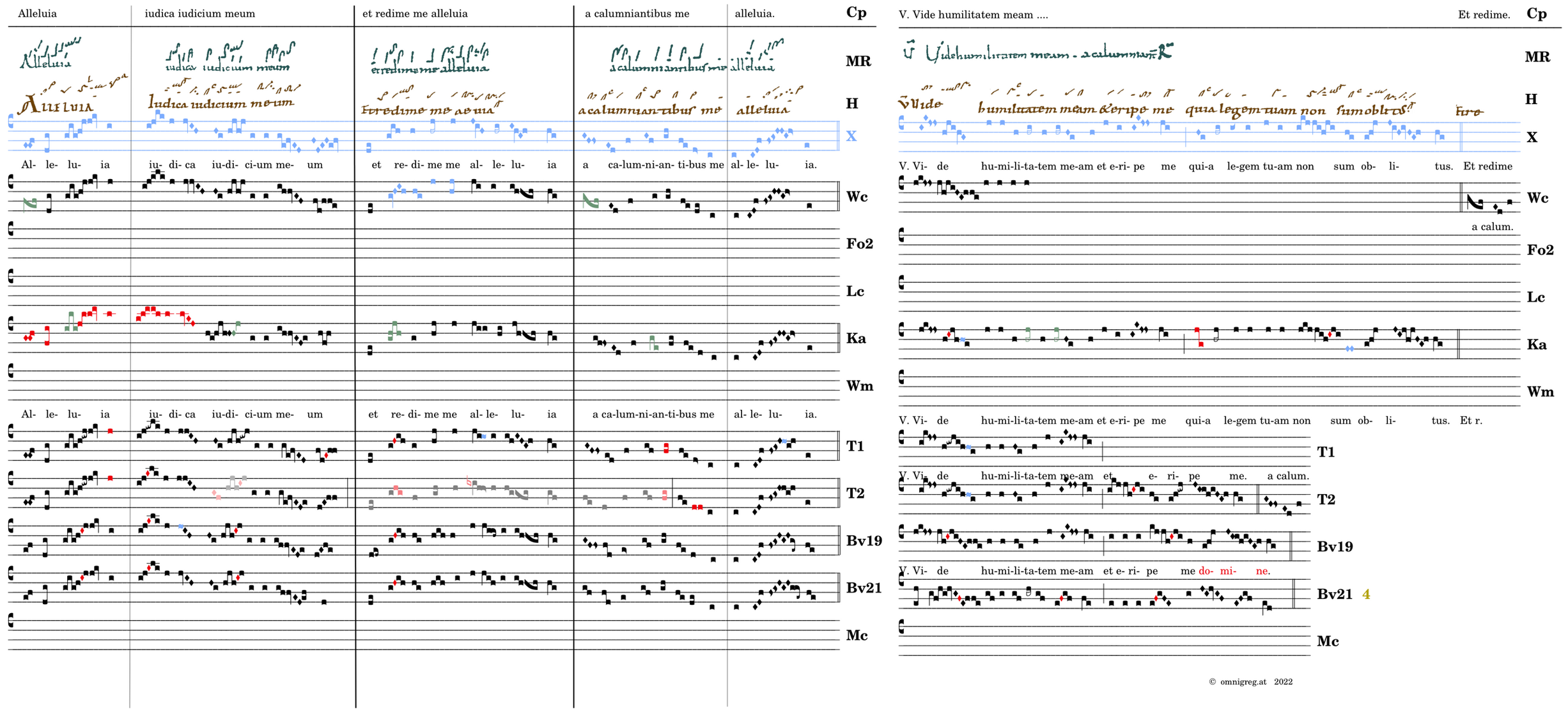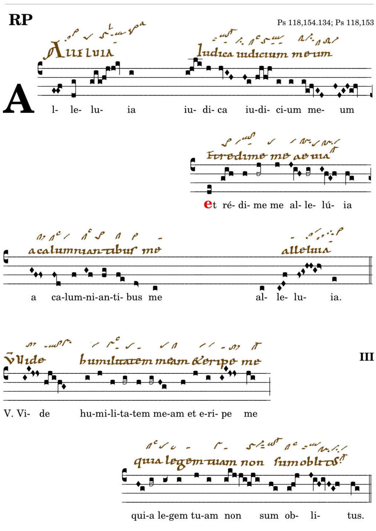 Alleluia / iudica iudicium meum / 📍 Et redime me alleluia / 📍a calumniantibus me / alleluia. V. Vide humilitatem meam (et eripe me* (quia legem tuam non sum oblitus)) (domine).
