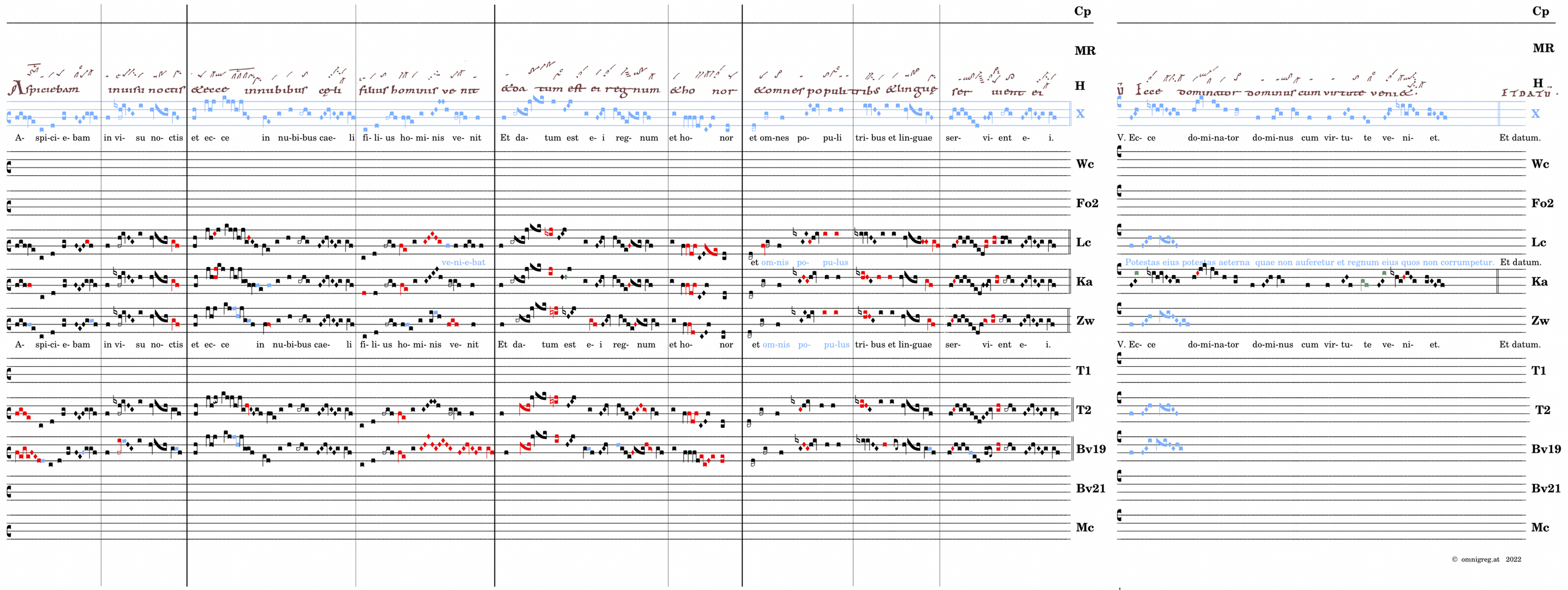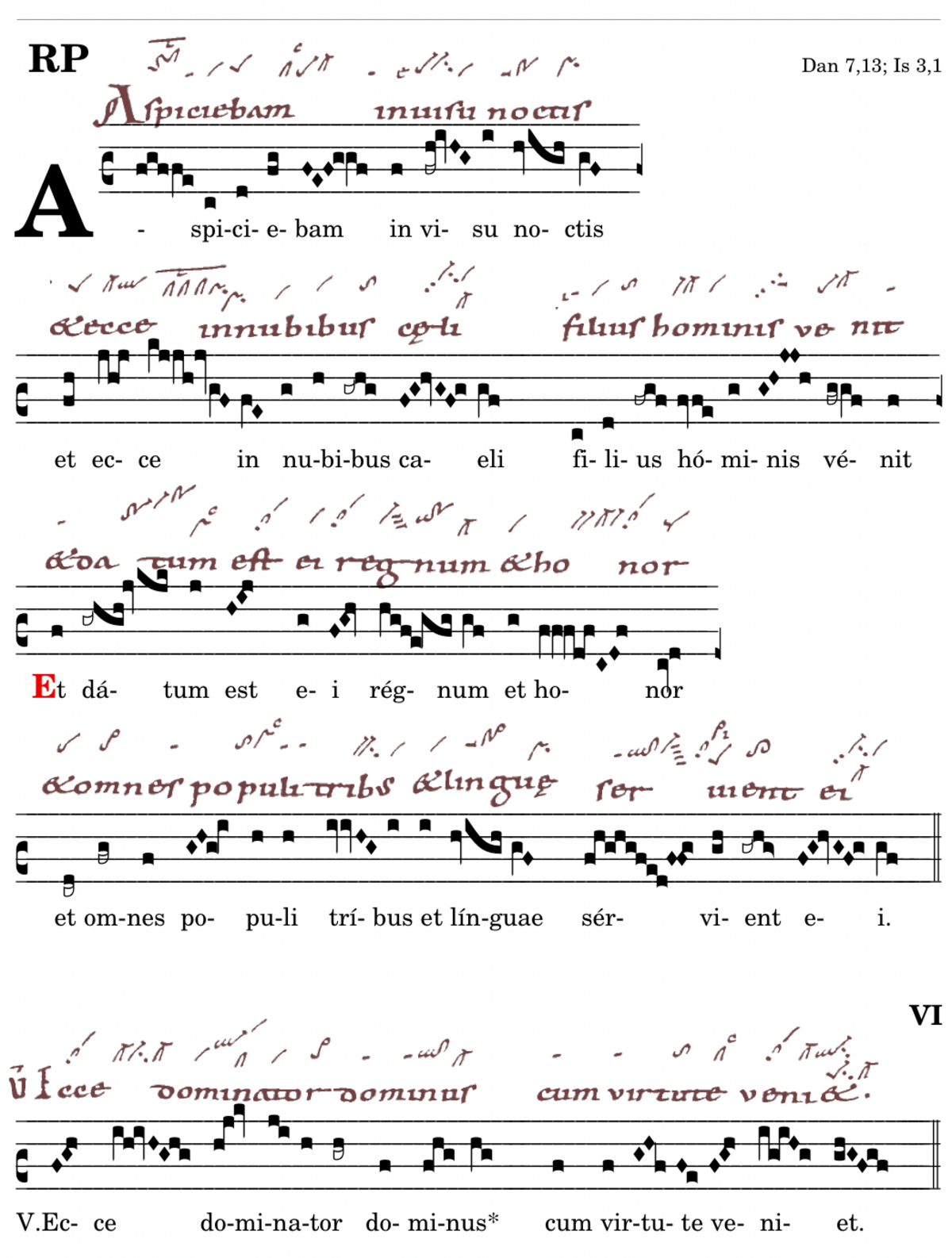 Aspiciebam / in visu noctis / et ecce in nubibus caeli / filius hominis venit (-veniebat) / 📍Et datum est ei regnum / et honor / et omnes populi / tribus et linguae / servient ei. V. Ecce dominator dominus* cum virtute veniet. (MR,T2,Lc,Zw,Bv1) V. Potestas eius potestas aeterna / quae non auferetur et regnum eius / quos non corrumpetur.