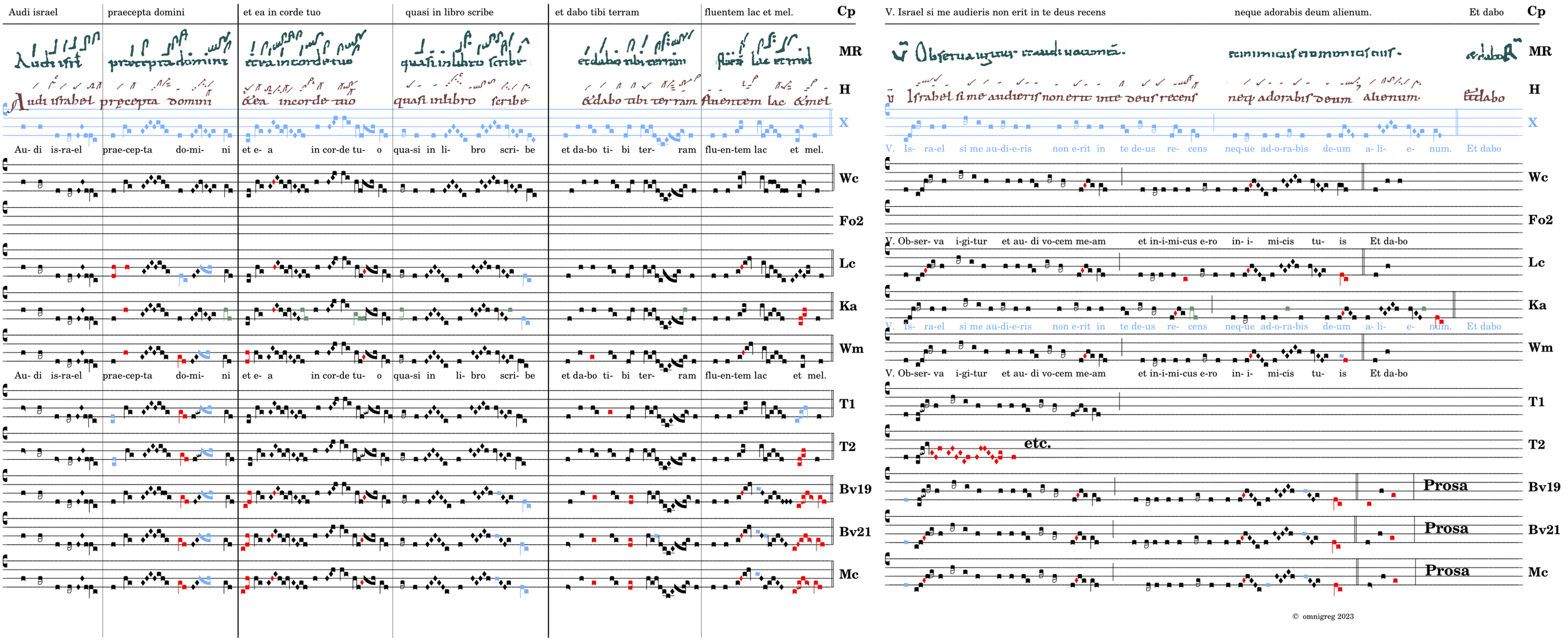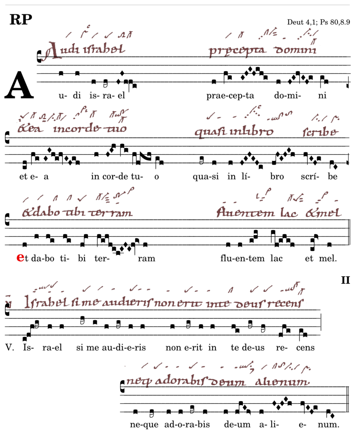 Audi israel / praecepta domini / et ea in corde tuo / quasi in libro scribe / 📍et dabo tibi terram / fluentem lac et mel. V. Israel si me audieris non erit in te deus recens* neque adorabis deum alienum. (omn) V. Observa igitur / et audi vocem meam* et inimicus ero / inimicis tuis.