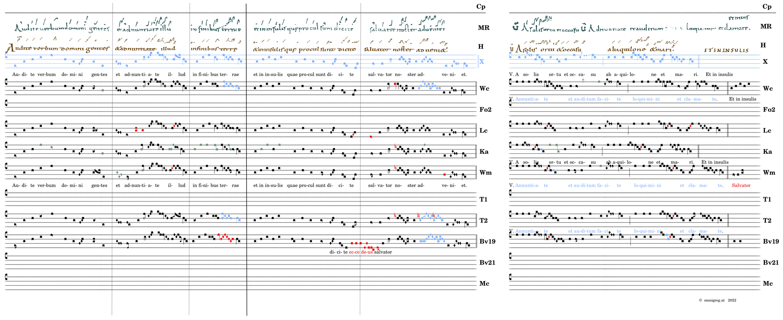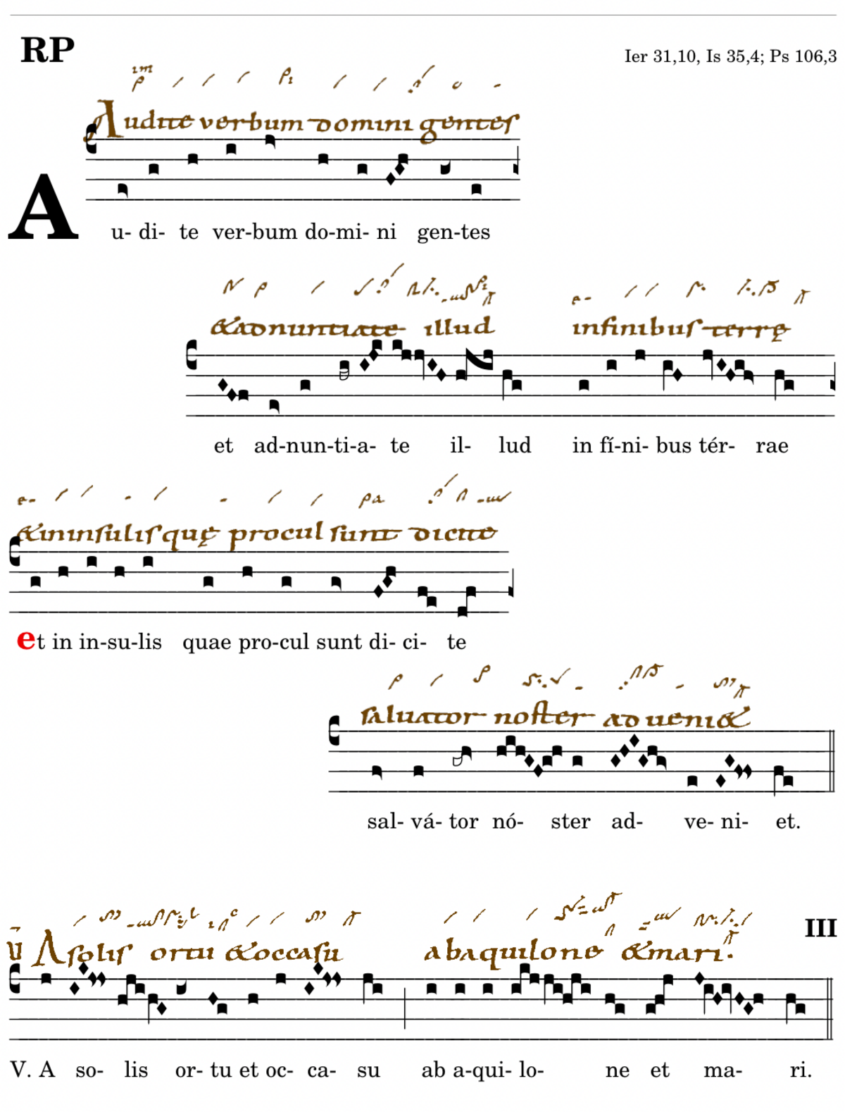 Audite verbum domini gentes / et adnuntiate illud / in finibus terrae / 📍Et in insulis quae procul sunt dicte 📍salvator noster adveniet. V. A solis ortu et occasu* ad aquilone et mari. (omnes) V. Annuntiate et auditum facite loquimini et clamate.