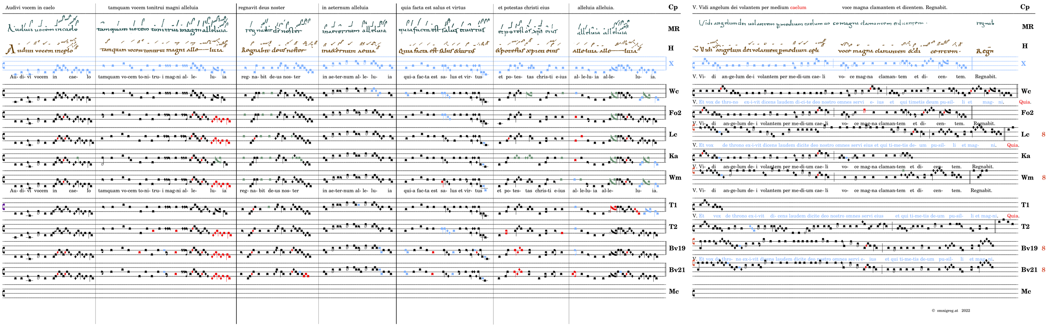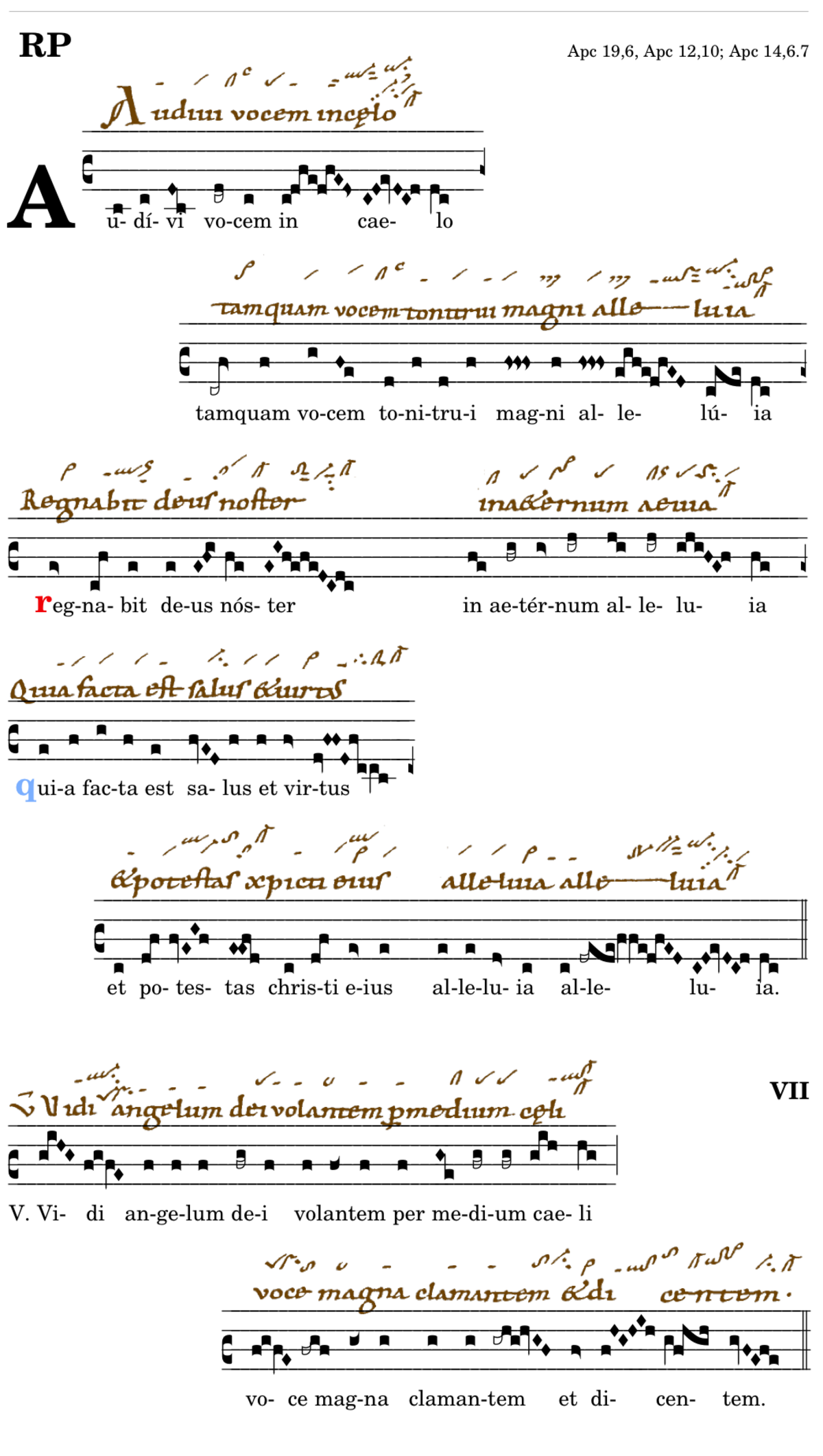 Audivi vocem in caelo / tamquam vocem tonitrui magni alleluia / 📍Regnabit deus noster / in aeternum alleluia / 📍quia facta est salus et virtus / et potestas christi eius / alleluia alleluia. V. Vidi angelum dei volantem per medium caeli* voce magna clamantem et dicentem. (Wc,Lc,T1,Bv) V.Et vox de throno exivit dicens / laudem dicite deo nostro omnes servi eius et qui timetis deum pusilli et magni .