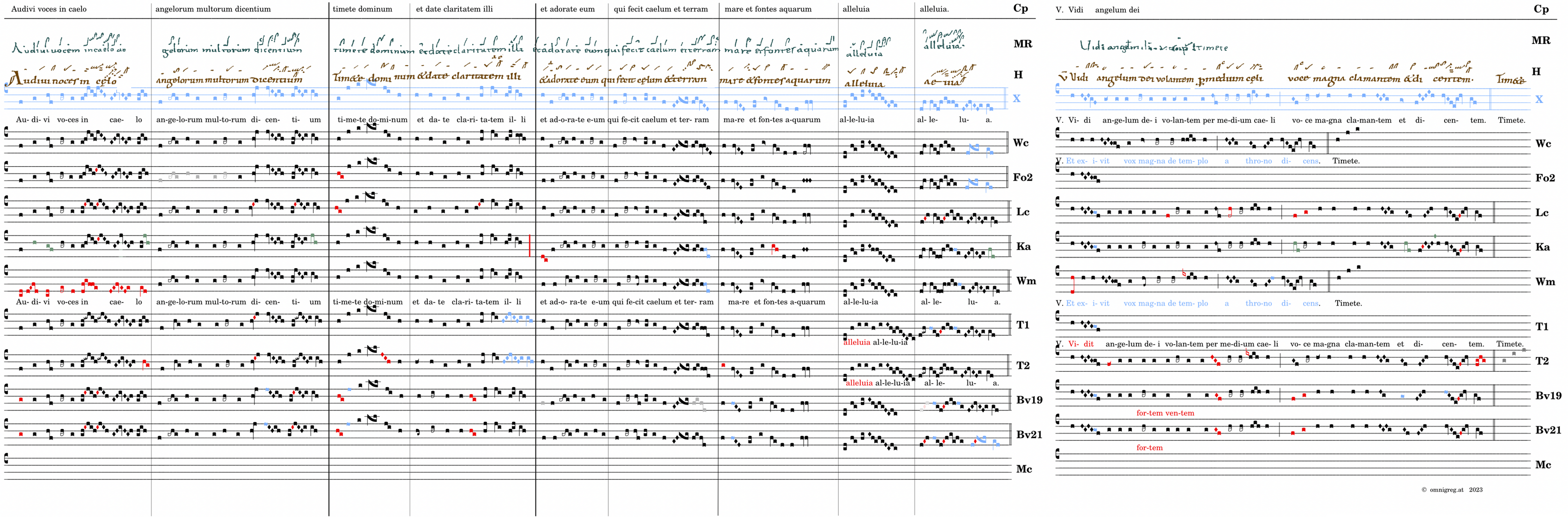 Audivi voces in caelo / angelorum multorum dicentium / 📍Timete dominum et date claritatem illi / et adorate eum qui fecit caelum et terram / mare et fontes aquarum / alleluia / alleluia. V. Vidi angelum dei volantem per medium caeli (-caelum)* voce magna clamantem et dicentem, (Wc,Wm) V. Et exivit vox magna de templo a throno dicens. (Bv1) V. Vidi angelum fortem ventem per medium caeli voce magna clamantem et dicentem. (Bv2) V. Vidi angelum fortem volantem per medium caelum voce magna clamantem et dicentem.