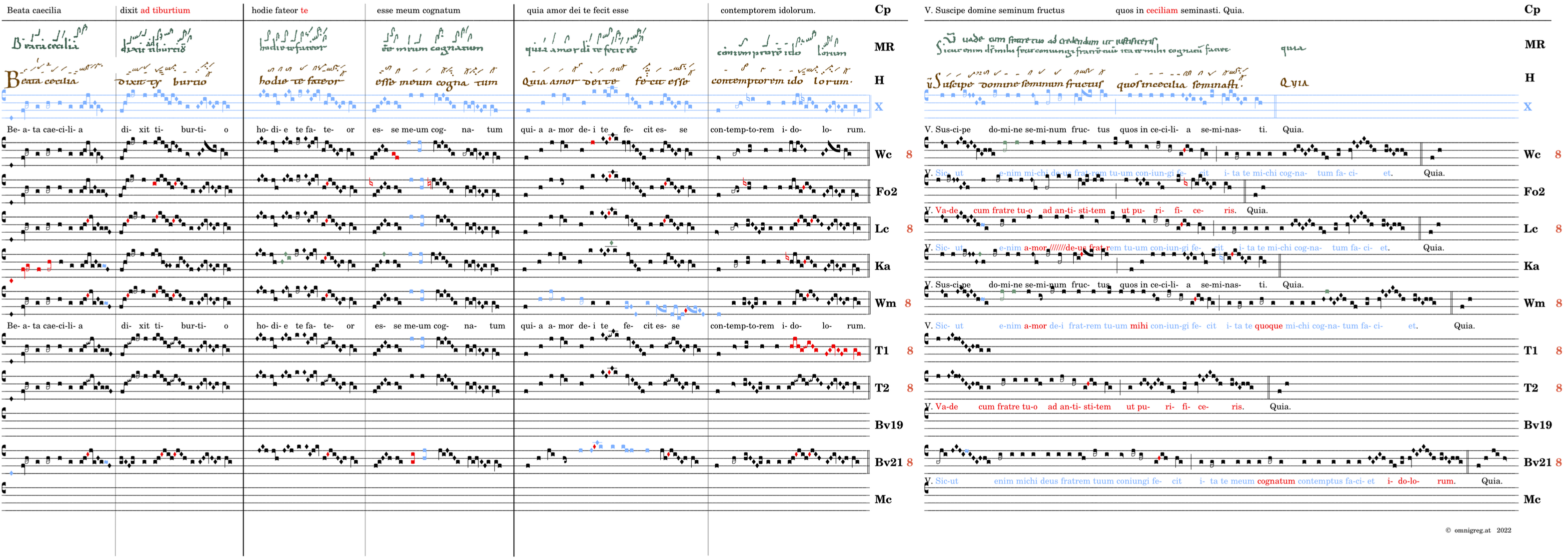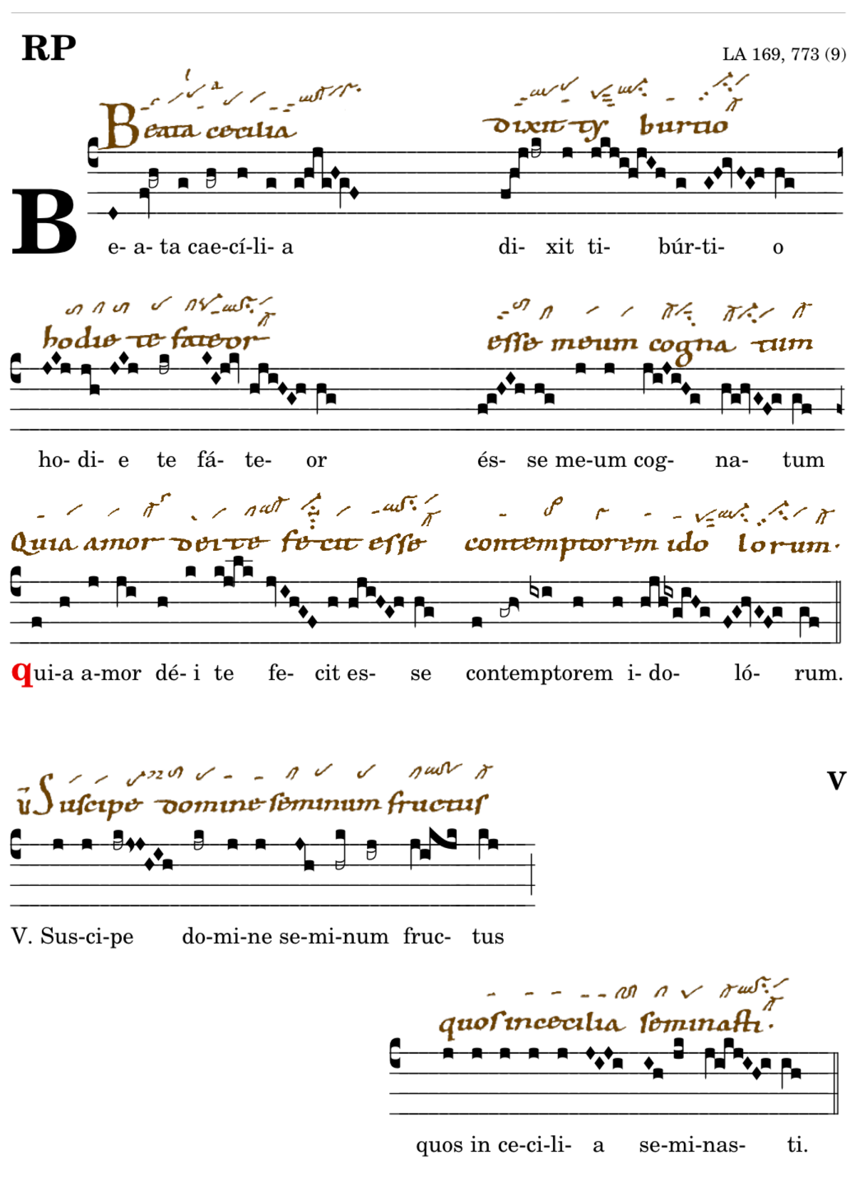 Beata caecilia / dixit tiburtio / hodie te fateor / esse mecum cognatum / 📍Quia amor dei te fecit esse / contemptorem idolorum. V. Suscipe domine seminum fructus* quos in cecilia seminasti. (MR,Wc,T1,Lc,Bv2) V. Sicut enim amor dei michi fratrem tuum michi coniugem fecit / ita te (quoque) michi cognatum faciet (esse). (MR) V. Vade cum fratre tuo ad credendum ut iustificeris. (T2,Fo2) V. Vade cum fratre tuo ad antistitem ut purificeris.