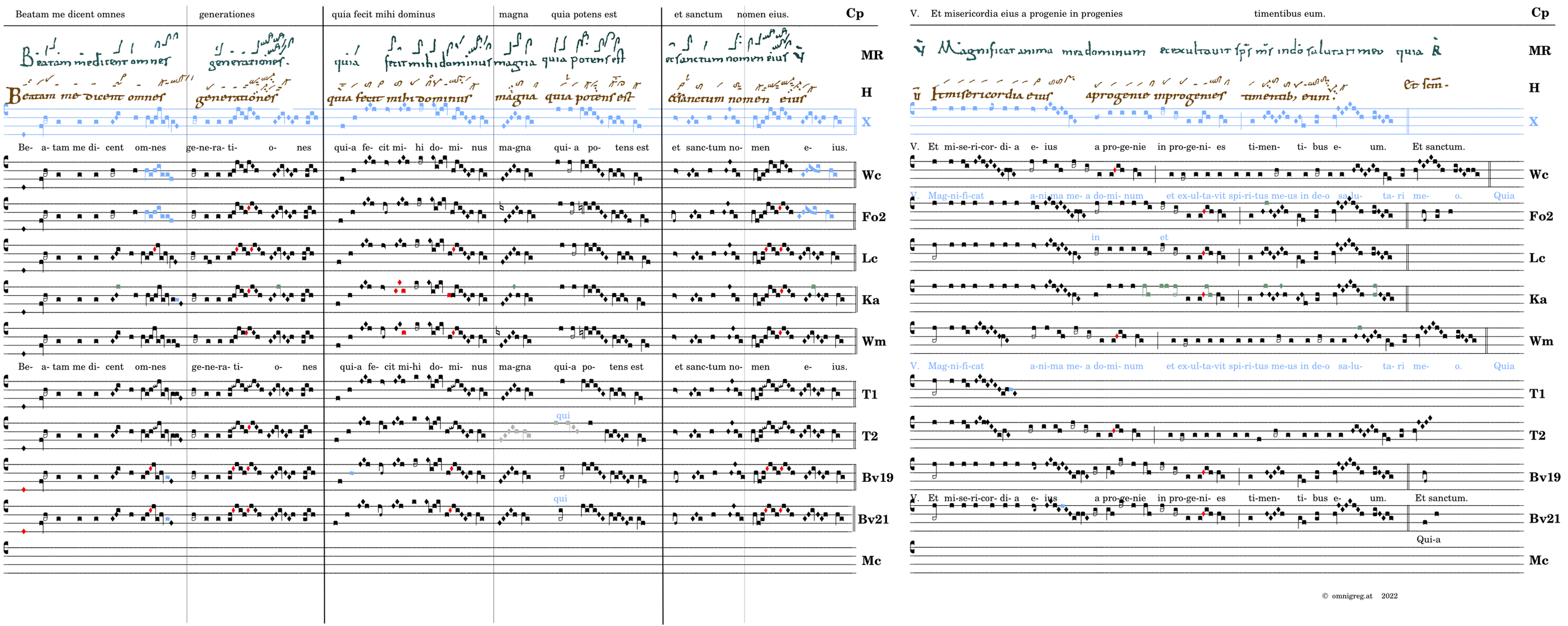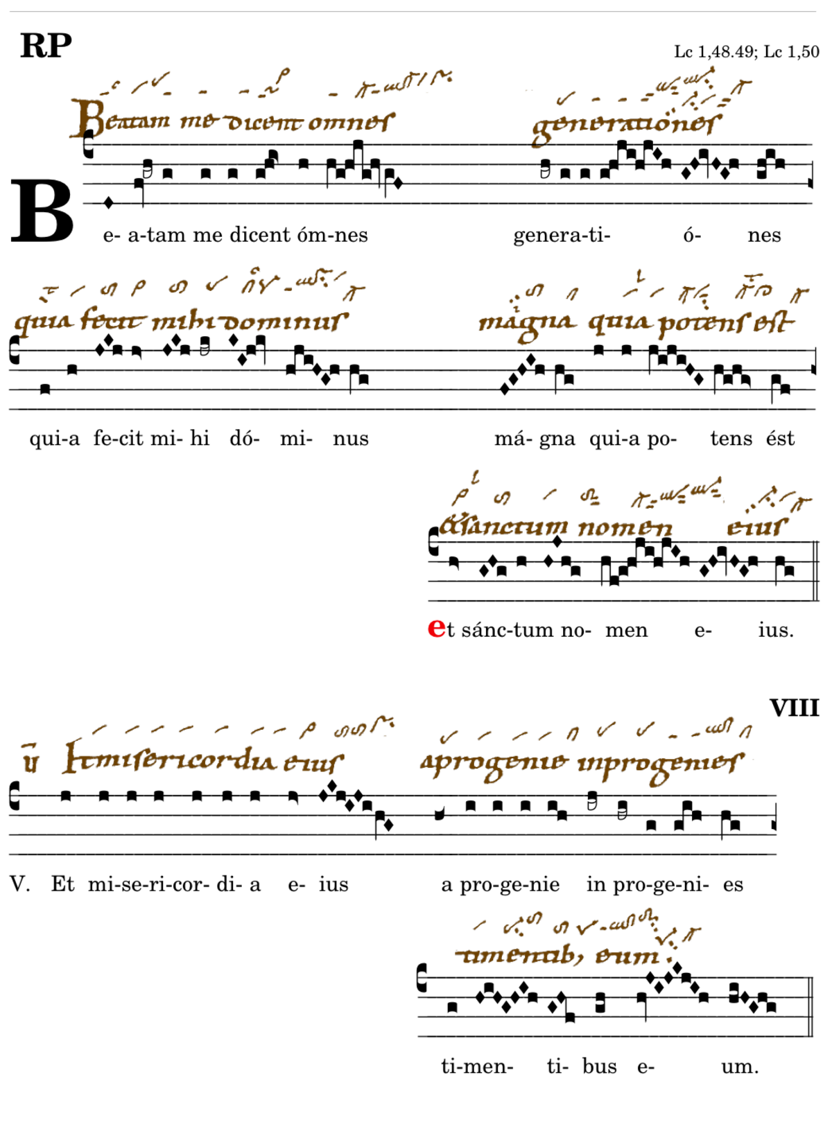 Beatam me dicent omnes / generationes / quia fécit mihi dominus / mágna quia potens est / 📍Et sánctum . nomen eius. V. Et misericordia eius a progenie in progenies* timentibus eum. (Wc,Wm,Tol) V. Magnificat anima mea dominum et exultavit spiritus meus in deo salutari meo.