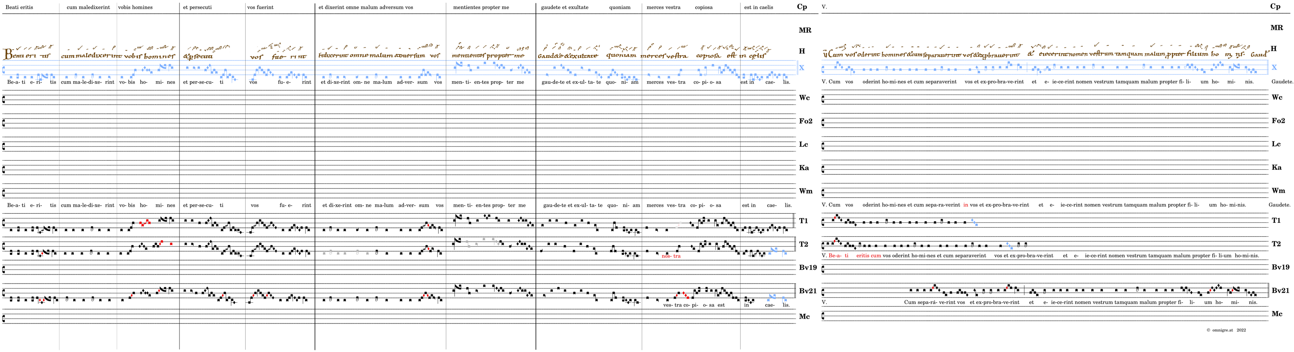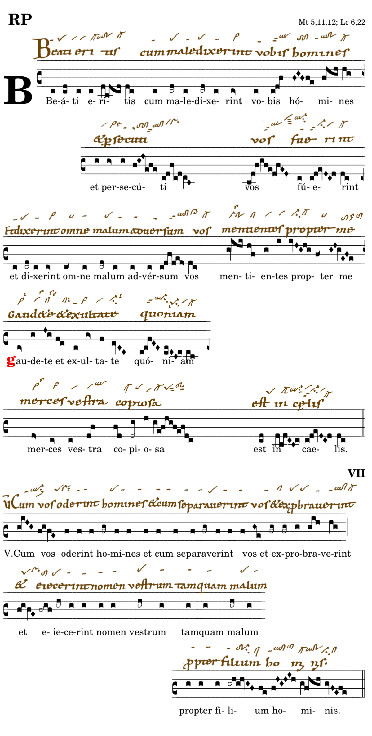 Beati eritis cum maledixerint vobis homines / et persecuti / vos fuerint / et dixerint omne malum adversum vos / mentientes propter me / 📍Gaudete et exultate / quoniam merces vestra / copiosa est in caelis. V. Cum (vos oderint homines / et cum) separaverint vos et exprobraverint* et eiecerint nomen vestrum tamquam malum propter filium hominis.