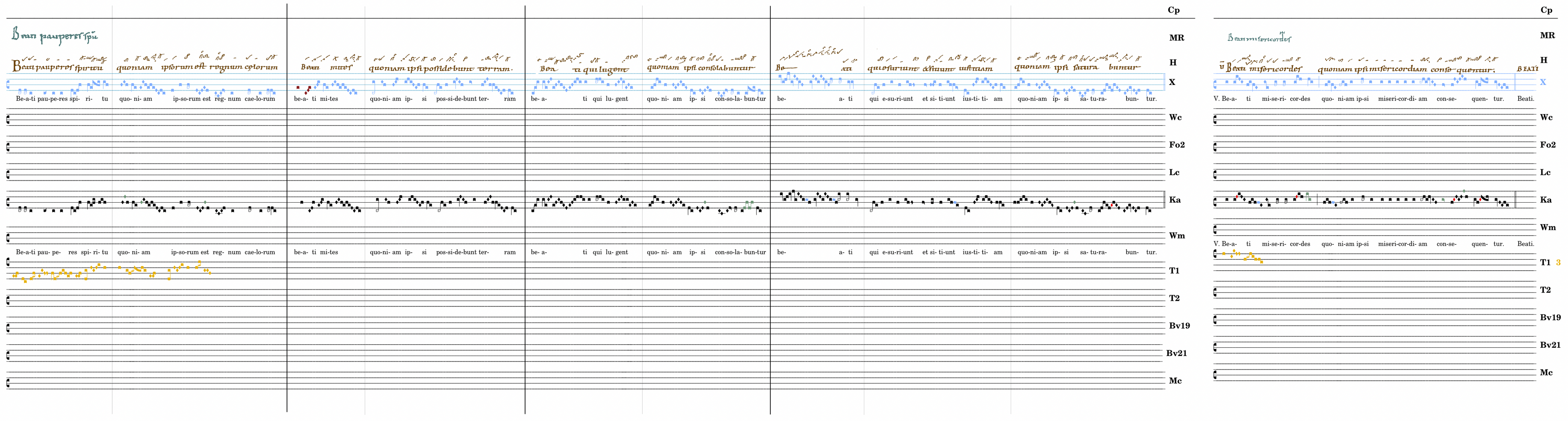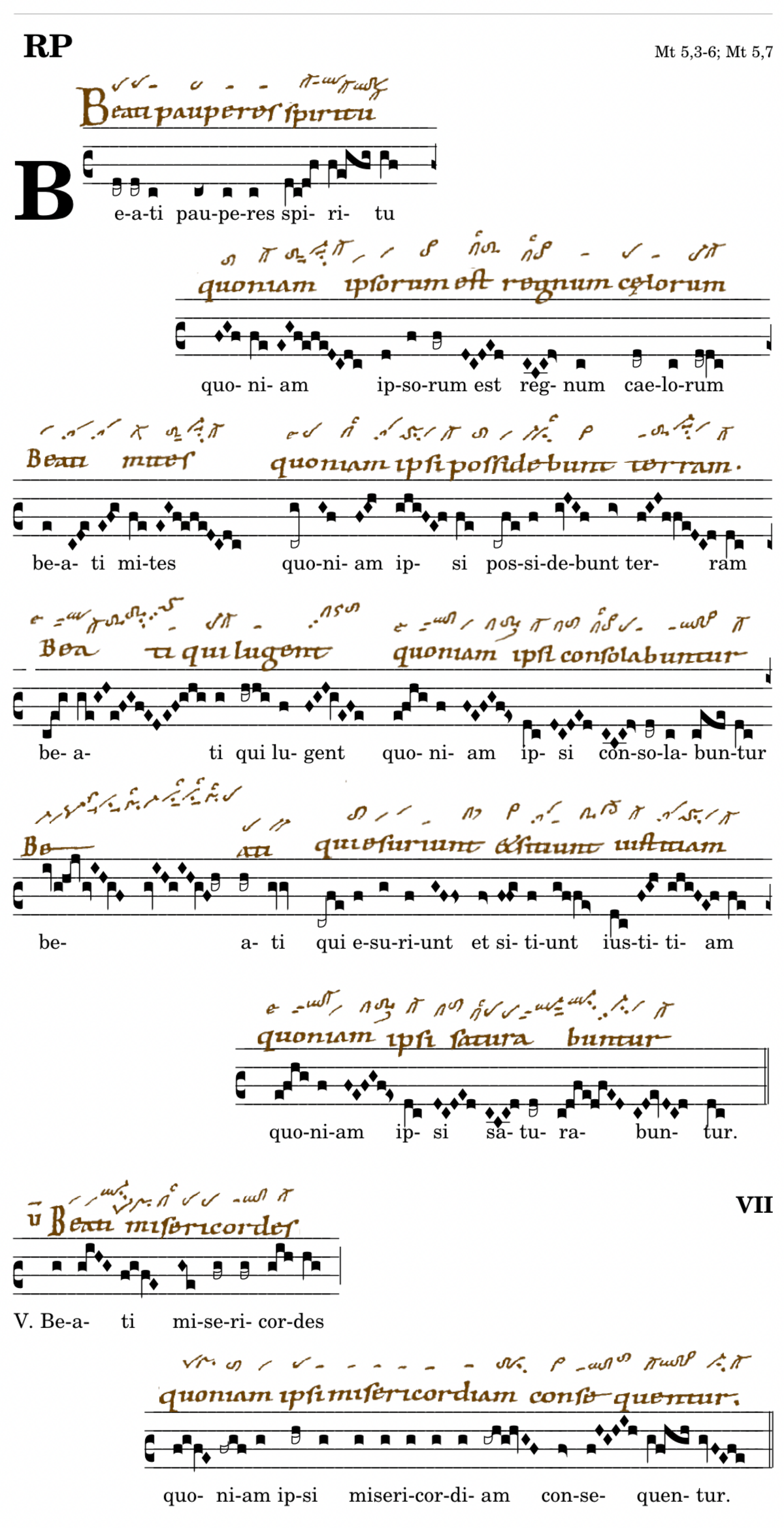 Beati pauperes spiritu / quoniam ipsorum est regnum caelorum / Beati mites / quoniam ipsi possidebunt terram / Beati qui lugent / quoniam ipsi consalabuntur / Beati qui esuriunt et sitiunt iustitiam / quoniam ipsi saturabuntur. V. Beati misericordes* quoniam ipsi misericordiam consequentur. R. Beati.