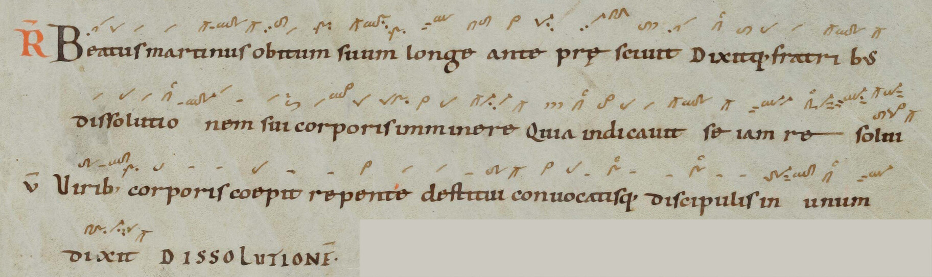 Beatus martinus / obitum suum / longe ante praescivit / dixitque fratribus 📍 dissolutionem / sui corporis imminere / 📍 quia indicavit se / iam resolvi. V. Viribus corporis coepit repente destitui* convocatisque discipulis in unum dixit. (Cp,MR,Wc,T1) V. Dixerunt discipuli ad beatum martinum cur nos pater deseris / aut cui nos desolatos relinquis. (Bv2) V. Respondentes discipuli ad beatum martinum dixerunt / cur nos pater deseris aut cui nos desolatos relinquis.