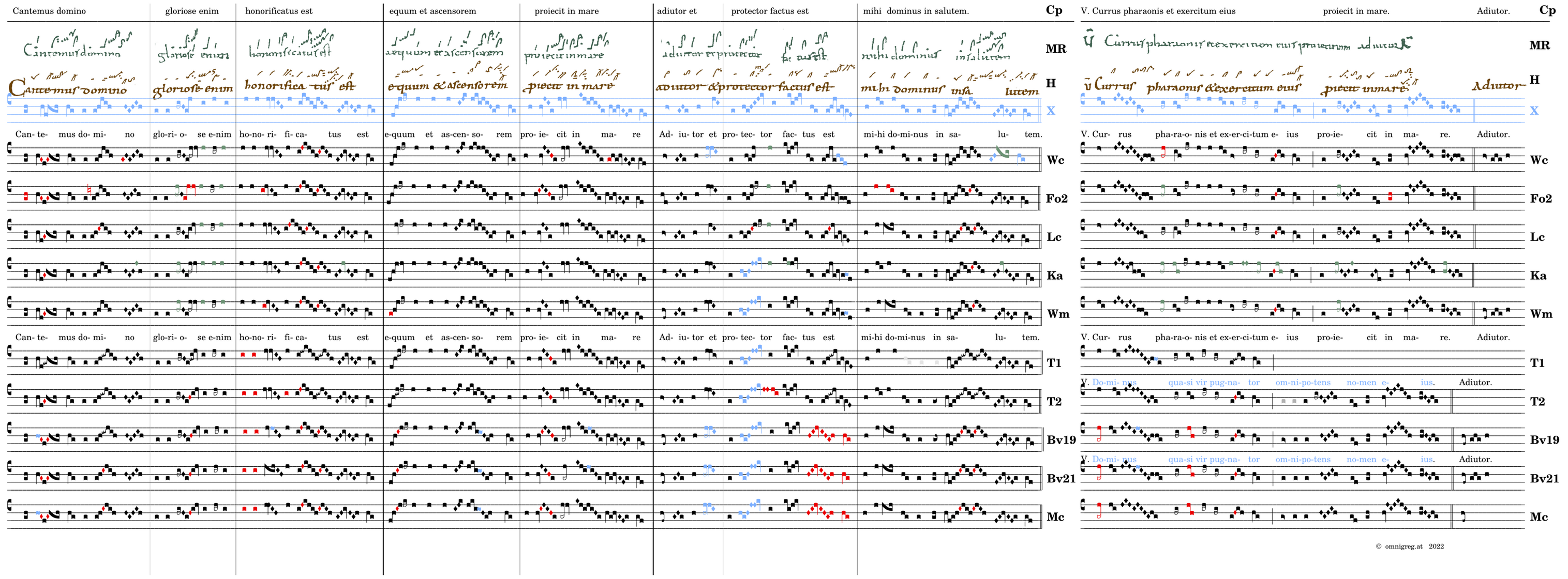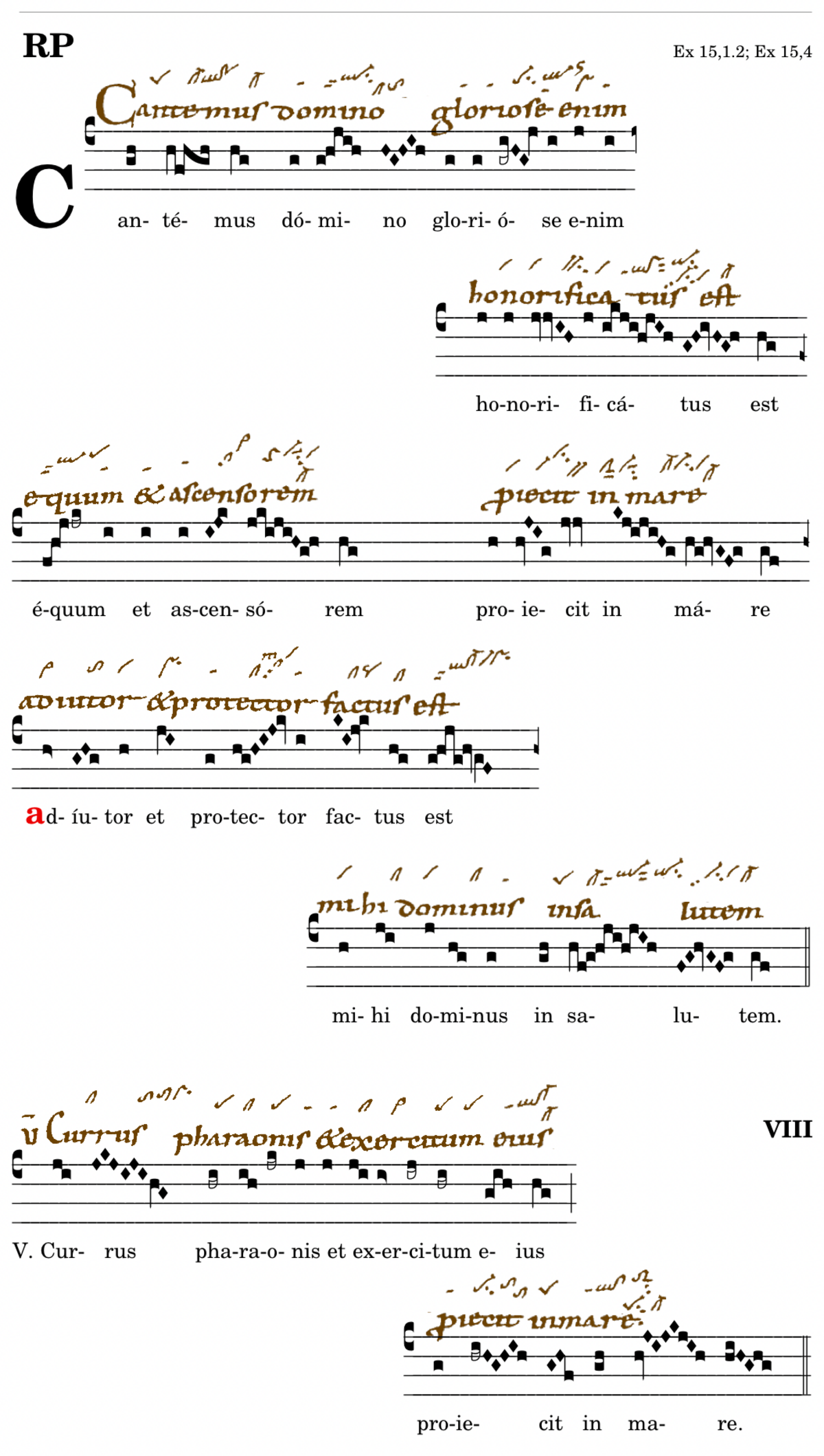 Cantemus domino/ gloriose enim / honorificatus est / equum et ascensorem / proiecit in mare / 📍Adiutor / et protector factus est / mihi dominus / in salutem. V. Currus pharaonis et exercitum eius* proiecit in mare. ((Tol,Bv,Mc) V. Dominus quasi vir pugnator omnipotens nomen eius.