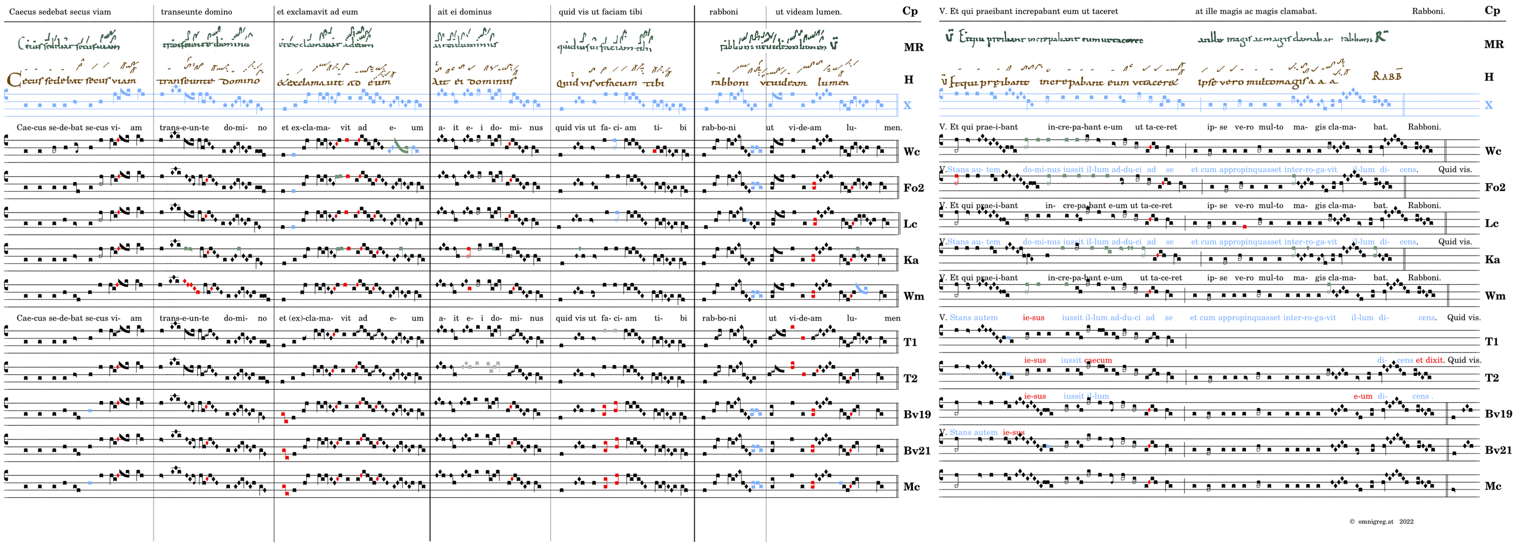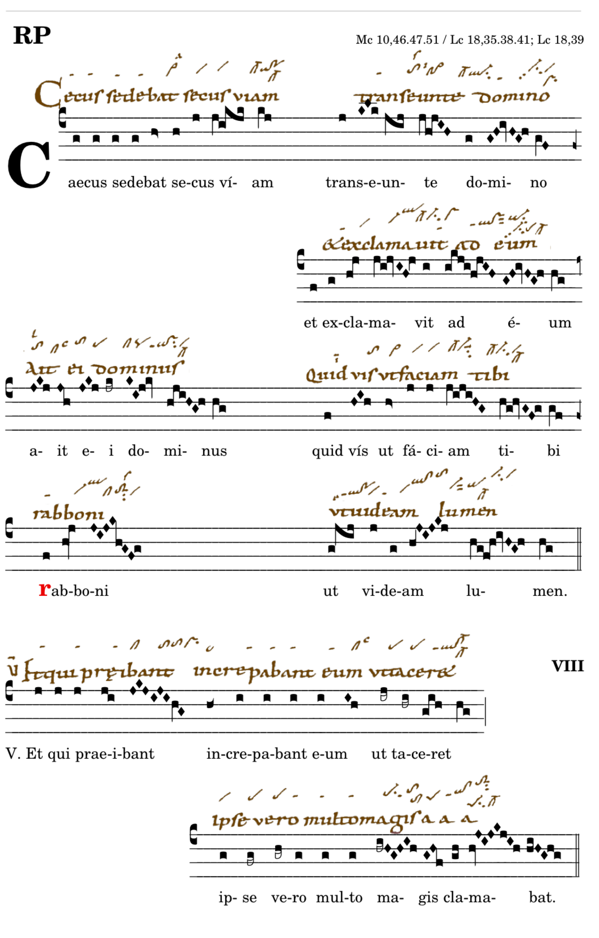 Caecus sedebat secus viam / transeunte domino / et exclamavit ad eum / ait ei dominus 📍 quid vis ut faciam tibi / 📍Rabboni / ut videam lumen. V. Et qui praeibant increpabant eum ut taceret* ipse vero multo magis clamabat. (MR) V. Et qui praeibant increpabant eum ut taceret ... ille magis ac magis clamabat. (Wc,Lc,Wm, Tol,Bv,Mc) V. Stans autem iesus iussit adduci ad se et cum appropinquasset interrogavit illum dicens.