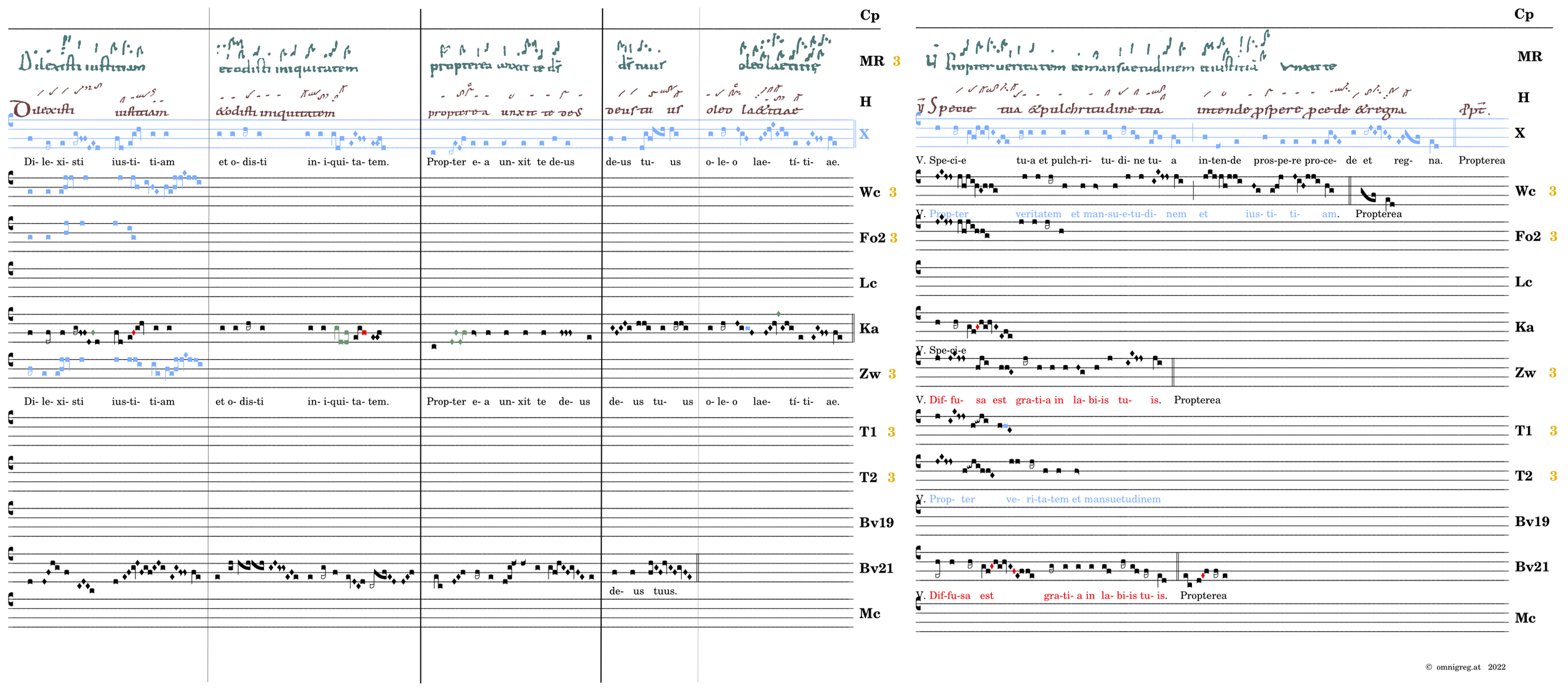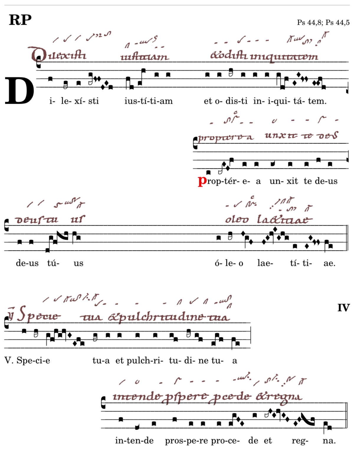 Dilexisti / iustitiam / et odisti iniquitatem / 📍Propterea 📍unxit te deus / deus tuus / oleo laetitiae. V. Specie tua et pulchritudine tua* intende prospere procede et regna. (MR,Wc,Lc,Fo2,T2) V. Propter veritatem et mansuetudinem et iustitiam. (T1,Zw,Bv2) V. Diffusa est gracia in labiis tuis.