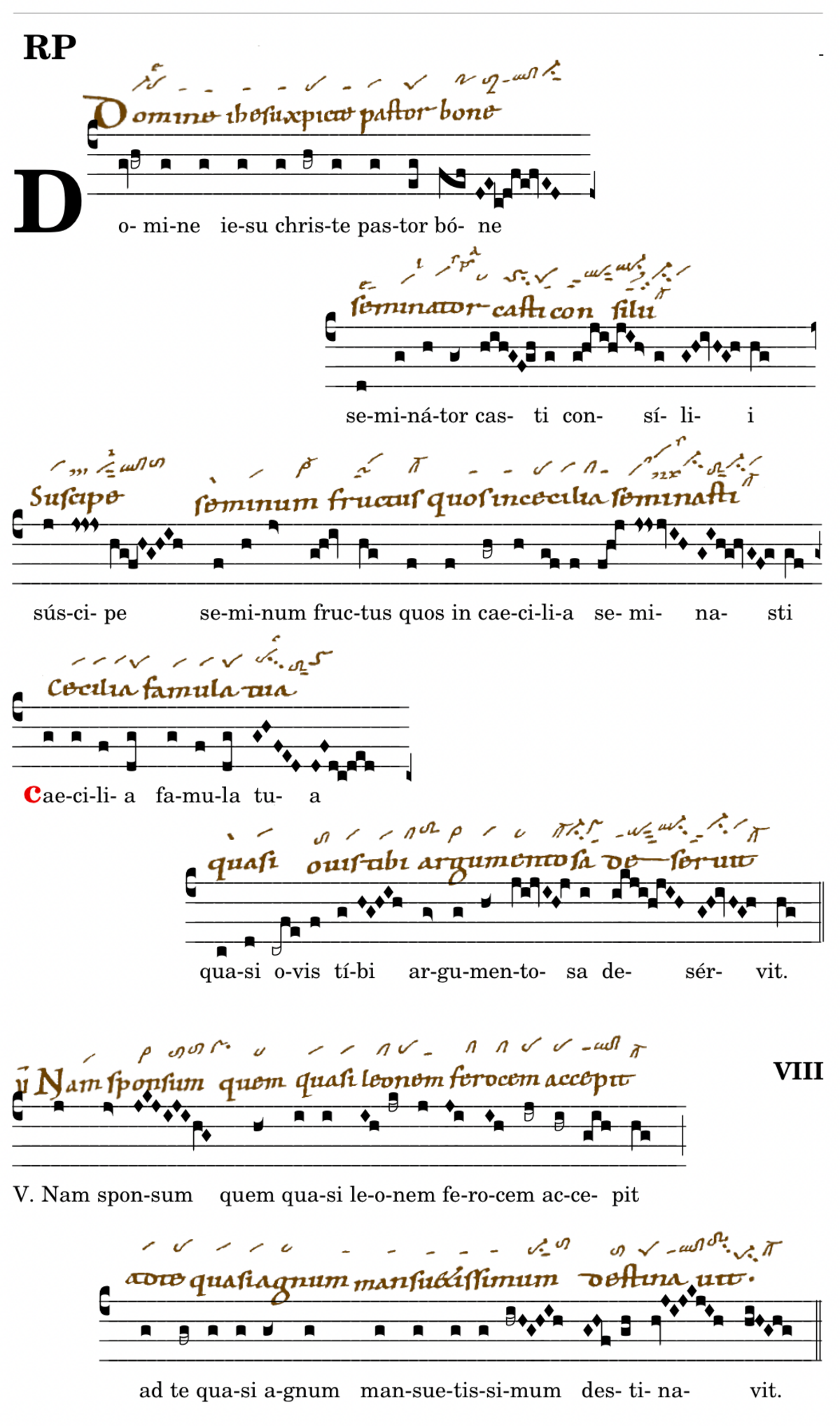 Domine iesu christe / pastor bone / seminator casti consilii / suscipe / seminum fructus quos in caecilia / seminasti / 📍Caecilia famula tua (domine) / quasi ovis tibi / argumentosa deservit. V. Nam sponsum quem quasi leonem ferocem accepit* ad te quasi agnum mansuetissimum destinavit.