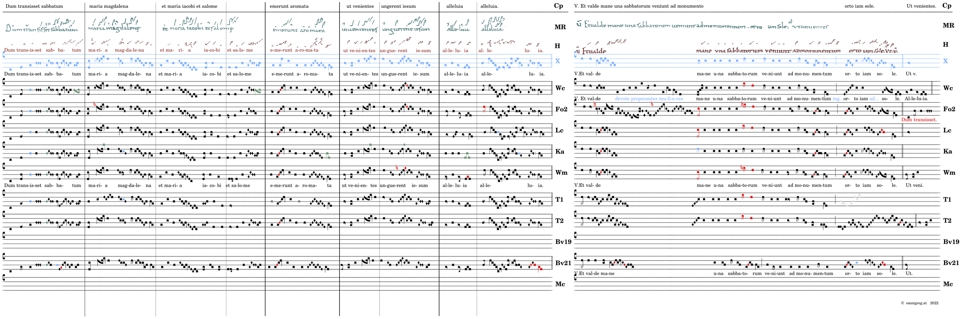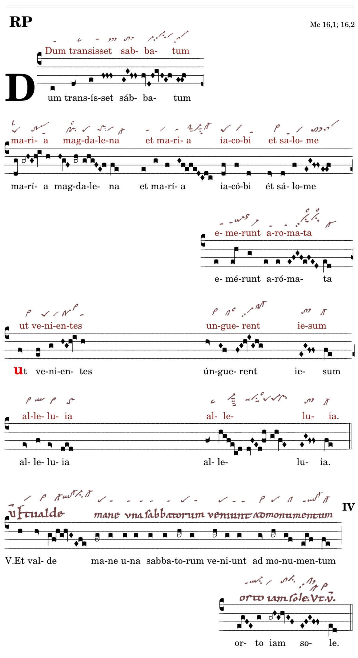 Dum transisset sabbatum / maria magdalena / et maria iacobi / et salome / emerunt aromata / 📍Ut venientes / unguerent iesum / 📍alleluia / alleluia. V. Et valde mane una sabbatorum veniunt ad monumentum* orto iam sole. (Wc) V. Et valde devote properantes mulieres mane una sabbatorum veniunt ad monumentum / inguento optimo ungere in sepulcto optant christum orto iam aderant / quem querebant non videbant fulgere sole.